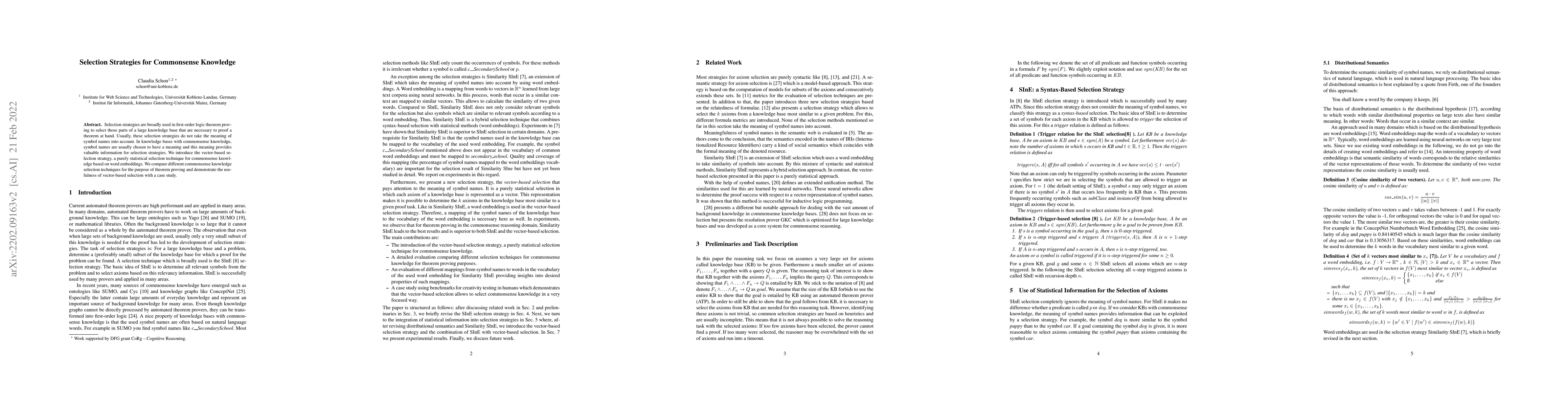 Selection strategies are broadly used in first-order logic theorem proving to select those parts of a large knowledge base that are necessary to proof a theorem at hand. Usually, these selection strategies do not take the meaning of symbol names into account. In knowledge bases with commonsense knowledge, symbol names are usually chosen to have a meaning and this meaning provides valuable information for selection strategies. We introduce the vector-based selection strategy, a purely statistical selection technique for commonsense knowledge based on word embeddings. We compare different commonsense knowledge selection techniques for the purpose of theorem proving and demonstrate the usefulness of vector-based selection with a case study.