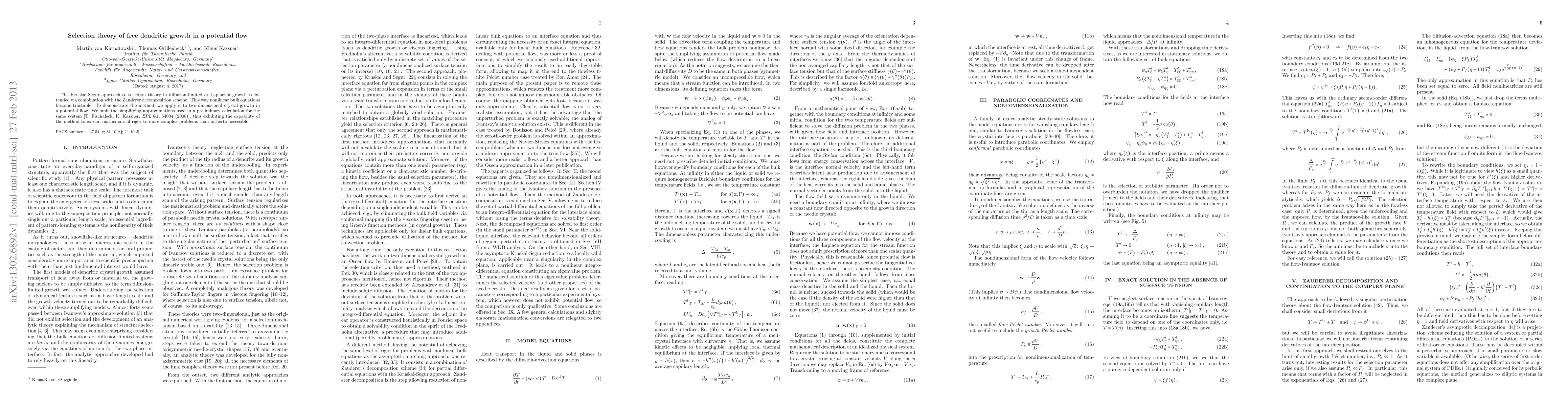 The Kruskal-Segur approach to selection theory in diffusion-limited or Laplacian growth is extended via combination with the Zauderer decomposition scheme. This way nonlinear bulk equations become tractable. To demonstrate the method, we apply it to two-dimensional crystal growth in a potential flow. We omit the simplifying approximations used in a preliminary calculation for the same system [T. Fischaleck, K. Kassner, EPL 81, 54004 (2008)], thus exhibiting the capability of the method to extend mathematical rigor to more complex problems than hitherto accessible.