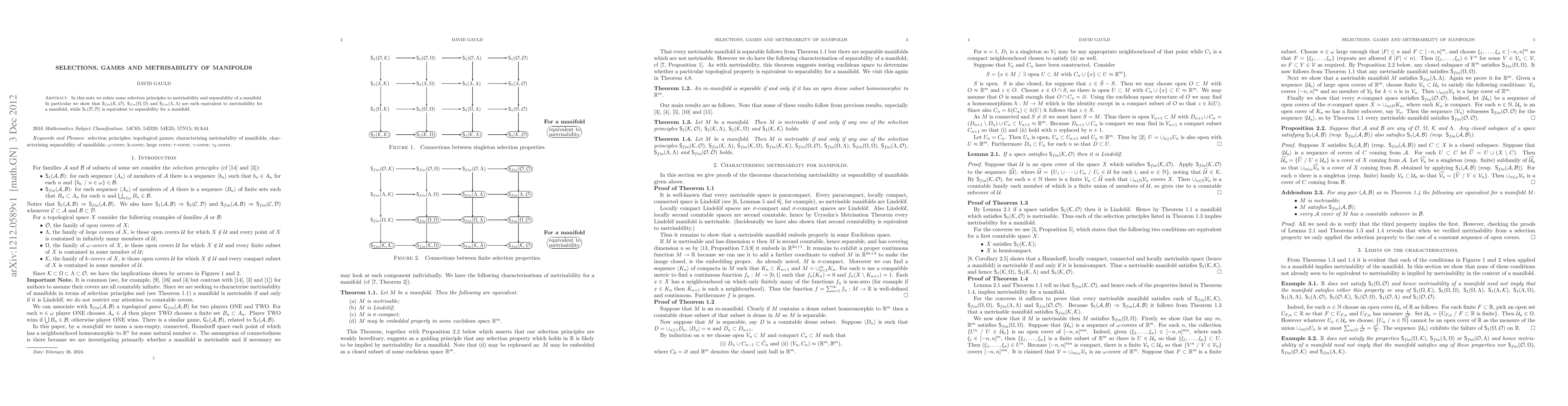 This paper connects selection principles to the metrisability and separability of manifolds, demonstrating that specific selection principles like $\sf{S}_{fin}(\mathcal K,\mathcal O)$ and $\sf{S}_{fin}(\Omega,\Omega)$ are equivalent to metrisability, while $\sf{S}_1(\mathcal D,\mathcal D)$ corresponds to separability.