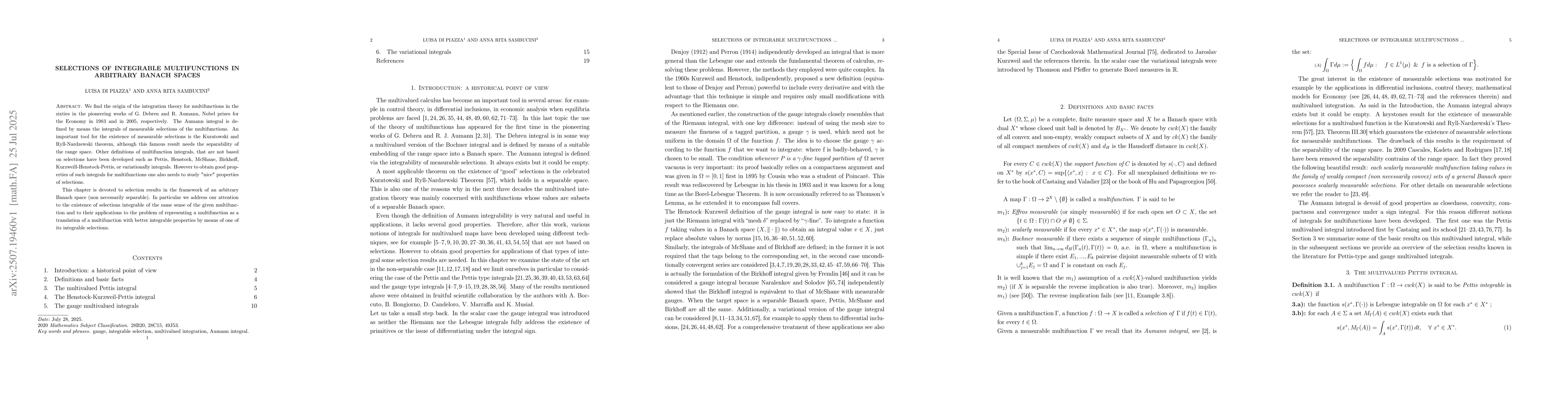 We find the origin of the integration theory for multifunctions in the sixties in the pioneering works of G. Debreu and R. Aumann, Nobel prizes for the Economy in 1983 and in 2005, respectively. The Aumann integral is defined by means the integrals of measurable selections of the multifunctions. An important tool for the existence of measurable selections is the Kuratowski and Ryll-Nardzewski theorem, although this famous result needs the separability of the range space. Other definitions of multifunction integrals, that are not based on selections have been developed such as Pettis, Henstock, McShane, Birkhoff, Kurzweill-Henstock-Pettis, or variationally integrals. However to obtain good properties of such integrals for multifunctions one also needs to study "nice" properties of selections. This chapter is devoted to selection results in the framework of an arbitrary Banach space (non necessarily separable). In particular we address our attention to the existence of selections integrable of the same sense of the given multifunction and to their applications to the problem of representing a multifunction as a translation of a multifunction with better integrable properties by means of one of its integrable selections.