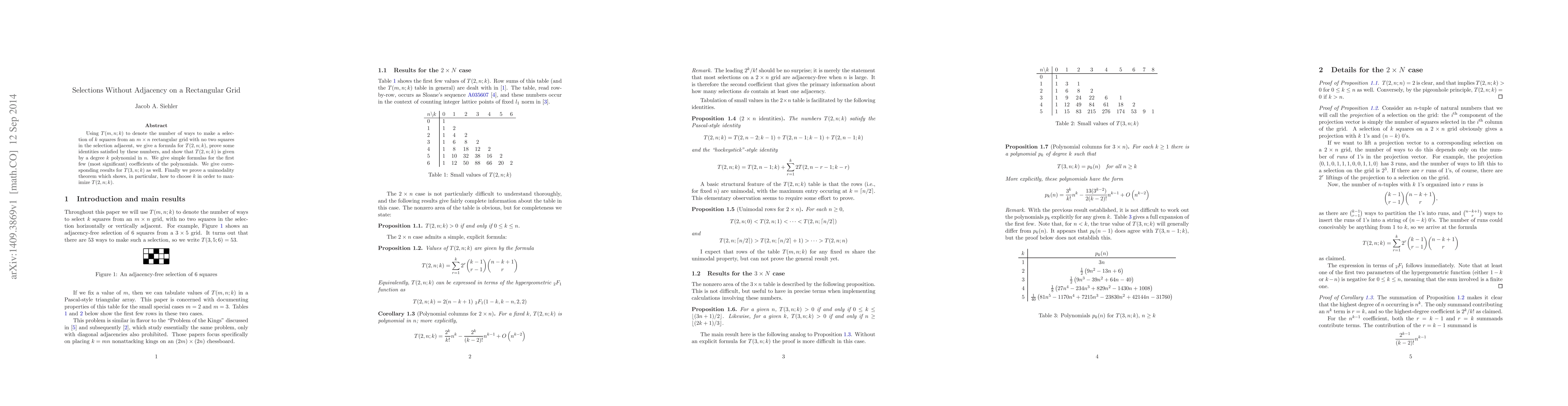 Using T(m,n;k) to denote the number of ways to make a selection of k squares from an (m x n) rectangular grid with no two squares in the selection adjacent, we give a formula for T(2,n;k), prove some identities satisfied by these numbers, and show that T(2,n;k) is given by a degree k polynomial in n. We give simple formulas for the first few (most significant) coefficients of the polynomials. We give corresponding results for T(3,n;k) as well. Finally we prove a unimodality theorem which shows, in particular, how to choose k in order to maximize T(2,n;k).