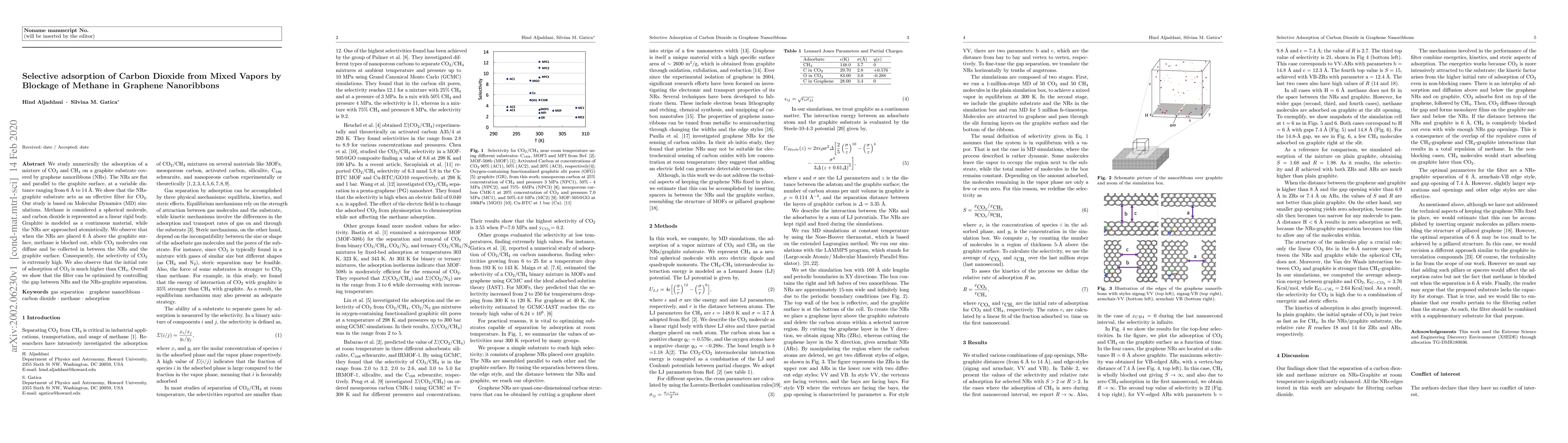 We study numerically the adsorption of a mixture of CO$_2$ and CH$_4$ on a graphite substrate covered by graphene nanoribbons (NRs). The NRs are flat and parallel to the graphite surface, at a variable distance ranging from 6 \r{A} to 14 \r{A}. We show that the NRs-graphite substrate acts as an effective filter for CO$_2$. Our study is based on Molecular Dynamics (MD) simulations. Methane is considered a spherical molecule, and carbon dioxide is represented as a linear rigid body. Graphite is modeled as a continuous material, while the NRs are approached atomistically. We observe that when the NRs are placed 6 \r{A} above the graphite surface, methane is blocked out, while CO$_2$ molecules can diffuse and be collected in between the NRs and the graphite surface. Consequently, the selectivity of CO$_2$ is extremely high. We also observe that the initial rate of adsorption of CO$_2$ is much higher than CH$_4$. Overall we show that the filter can be optimized by controlling the gap between NRs and the NRs-graphite separation.