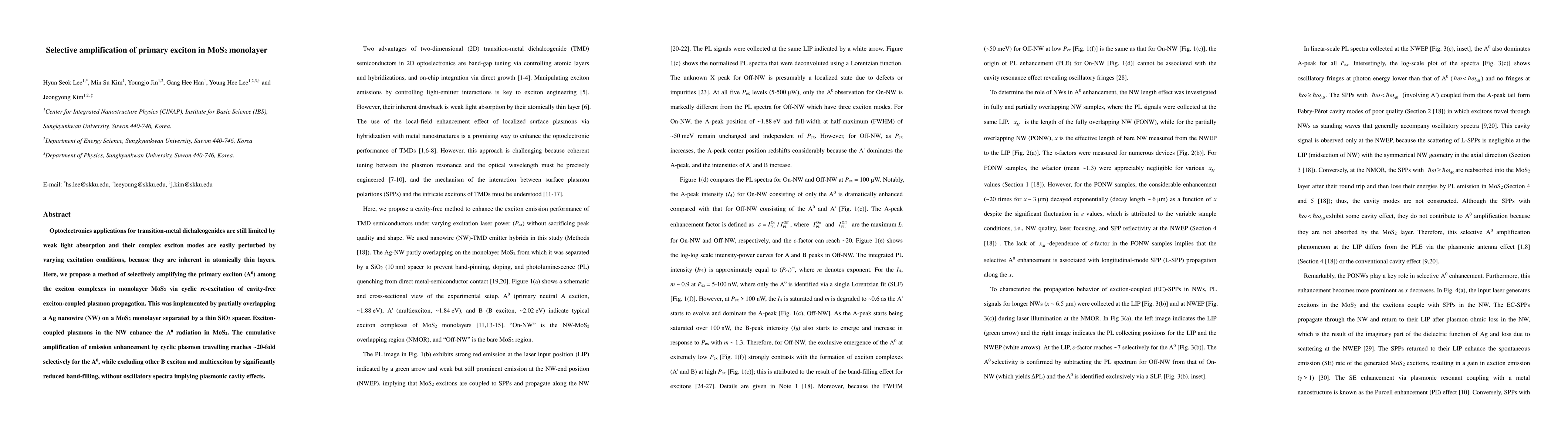 This research proposes a method to selectively amplify the primary exciton (A0) in monolayer MoS2 using cyclic re-excitation and plasmon propagation enhanced by a silver nanowire, achieving ~20-fold amplification for A0 without affecting other exciton modes. This technique utilizes a thin SiO2 spacer to selectively boost A0 emission while minimizing band-filling and avoiding plasmonic cavity effects.