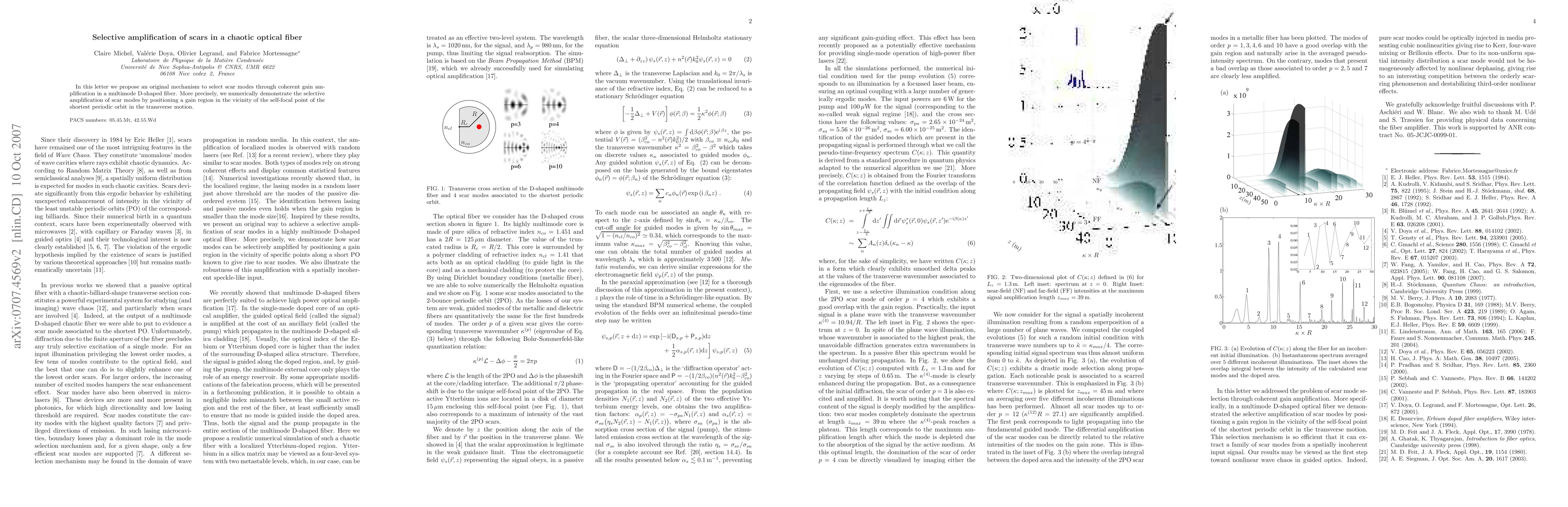 In this letter we propose an original mechanism to select scar modes through coherent gain amplification in a multimode D-shaped fiber. More precisely, we numerically demonstrate how scar modes can be amplified by positioning a gain region in the vicinity of specific points of a short periodic orbit known to give rise to scar modes.
