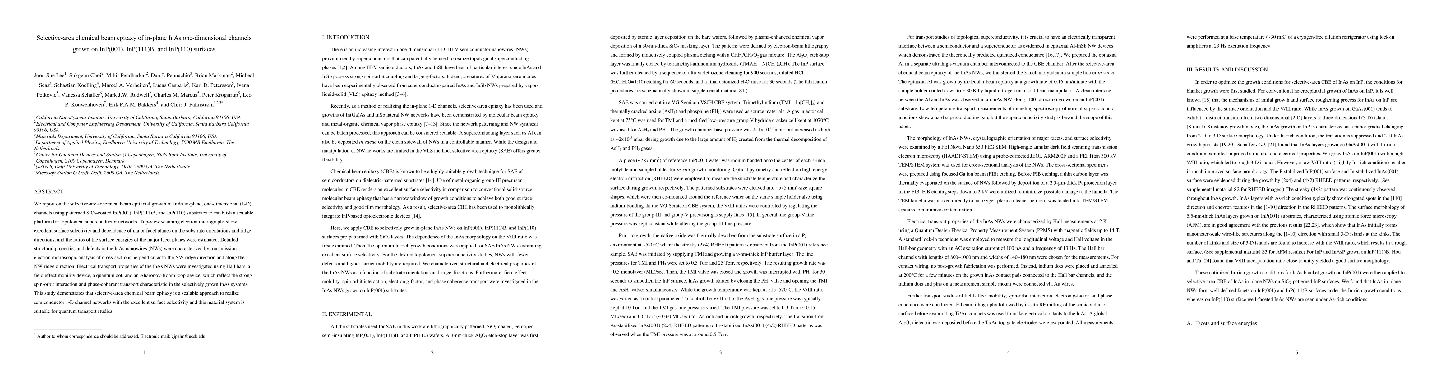 We report on the selective-area chemical beam epitaxial growth of InAs in-plane, one-dimensional (1-D) channels using patterned SiO$_{2}$-coated InP(001), InP(111)B, and InP(110) substrates to establish a scalable platform for topological superconductor networks. Top-view scanning electron micrographs show excellent surface selectivity and dependence of major facet planes on the substrate orientations and ridge directions, and the ratios of the surface energies of the major facet planes were estimated. Detailed structural properties and defects in the InAs nanowires (NWs) were characterized by transmission electron microscopic analysis of cross-sections perpendicular to the NW ridge direction and along the NW ridge direction. Electrical transport properties of the InAs NWs were investigated using Hall bars, a field effect mobility device, a quantum dot, and an Aharonov-Bohm loop device, which reflect the strong spin-orbit interaction and phase-coherent transport characteristic in the selectively grown InAs systems. This study demonstrates that selective-area chemical beam epitaxy is a scalable approach to realize semiconductor 1-D channel networks with the excellent surface selectivity and this material system is suitable for quantum transport studies.