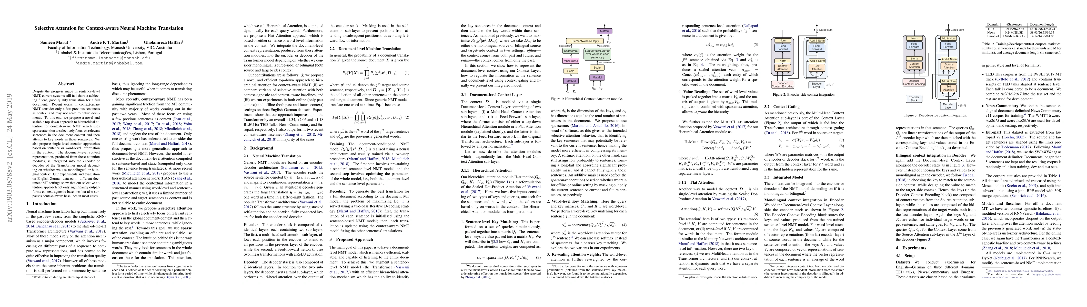This paper proposes a scalable hierarchical attention mechanism for context-aware neural machine translation, focusing selectively on relevant sentences and keywords to improve translation quality across documents. The approach outperforms both context-agnostic and context-aware baselines in experiments on English-German datasets.