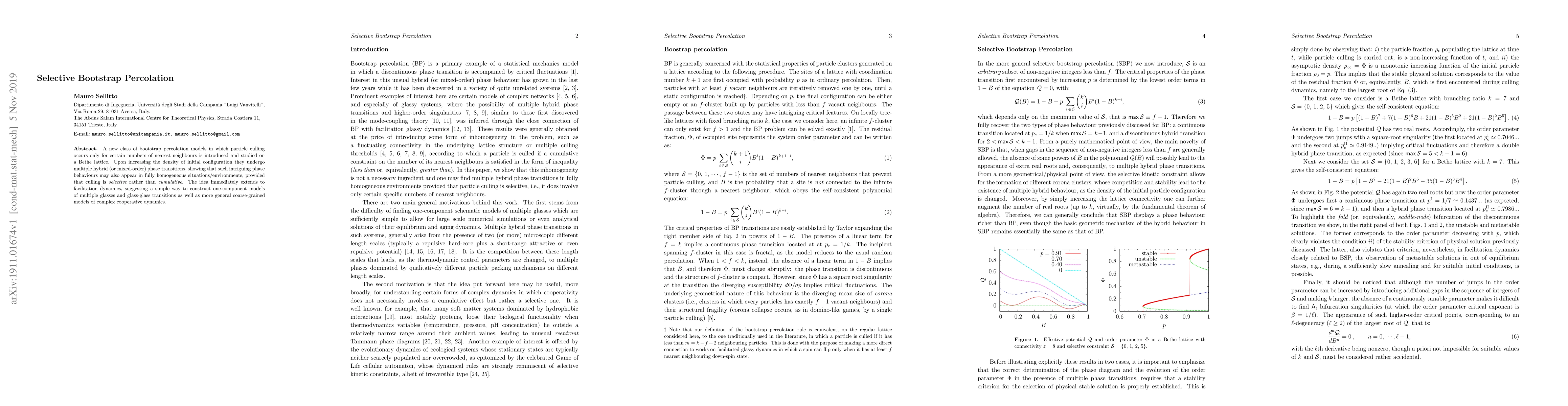 A new class of bootstrap percolation models in which particle culling occurs only for certain numbers of nearest neighbours is introduced and studied on a Bethe lattice. Upon increasing the density of initial configuration they undergo multiple hybrid (or mixed-order) phase transitions, showing that such intriguing phase behaviours may also appear in fully homogeneous situations/environments, provided that culling is selective rather than cumulative. The idea immediately extends to facilitation dynamics, suggesting a simple way to construct one-component models of multiple glasses and glass-glass transitions as well as more general coarse-grained models of complex cooperative dynamics.