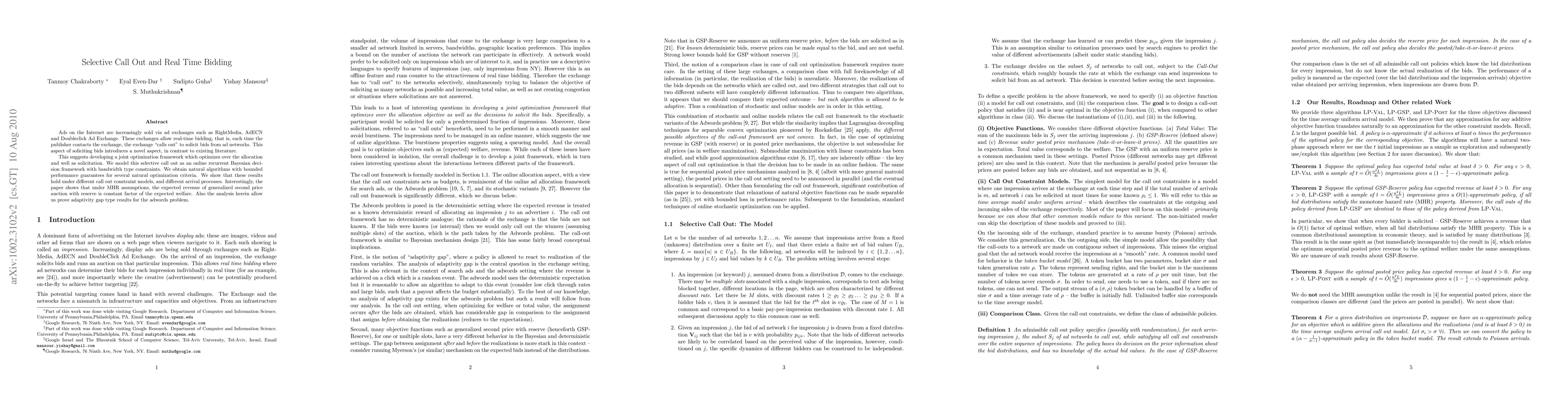 Ads on the Internet are increasingly sold via ad exchanges such as RightMedia, AdECN and Doubleclick Ad Exchange. These exchanges allow real-time bidding, that is, each time the publisher contacts the exchange, the exchange ``calls out'' to solicit bids from ad networks. This aspect of soliciting bids introduces a novel aspect, in contrast to existing literature. This suggests developing a joint optimization framework which optimizes over the allocation and well as solicitation. We model this selective call out as an online recurrent Bayesian decision framework with bandwidth type constraints. We obtain natural algorithms with bounded performance guarantees for several natural optimization criteria. We show that these results hold under different call out constraint models, and different arrival processes. Interestingly, the paper shows that under MHR assumptions, the expected revenue of generalized second price auction with reserve is constant factor of the expected welfare. Also the analysis herein allow us prove adaptivity gap type results for the adwords problem.