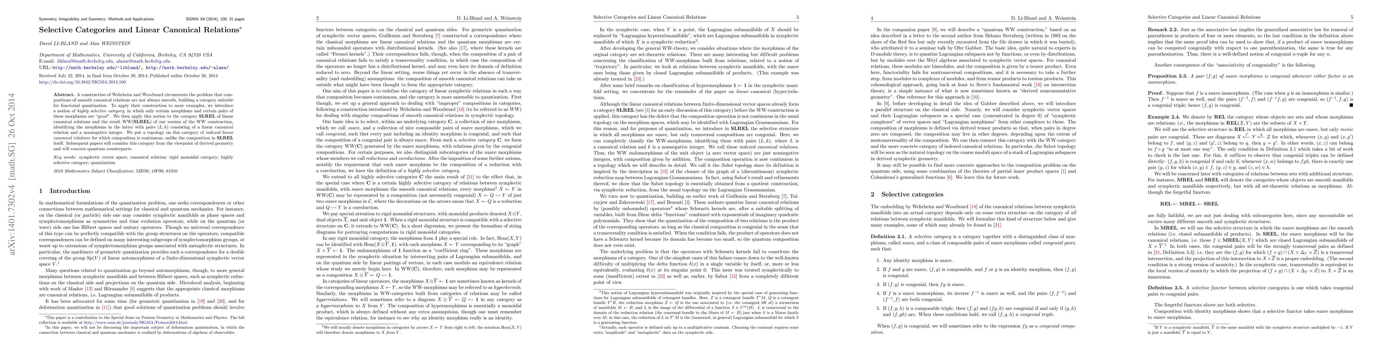 A construction of Wehrheim and Woodward circumvents the problem that compositions of smooth canonical relations are not always smooth, building a category suitable for functorial quantization. To apply their construction to more examples, we introduce a notion of highly selective category, in which only certain morphisms and certain pairs of these morphisms are "good". We then apply this notion to the category $\mathbf{SLREL}$ of linear canonical relations and the result ${\rm WW}(\mathbf{SLREL})$ of our version of the WW construction, identifying the morphisms in the latter with pairs $(L,k)$ consisting of a linear canonical relation and a nonnegative integer. We put a topology on this category of indexed linear canonical relations for which composition is continuous, unlike the composition in $\mathbf{SLREL}$ itself. Subsequent papers will consider this category from the viewpoint of derived geometry and will concern quantum counterparts.