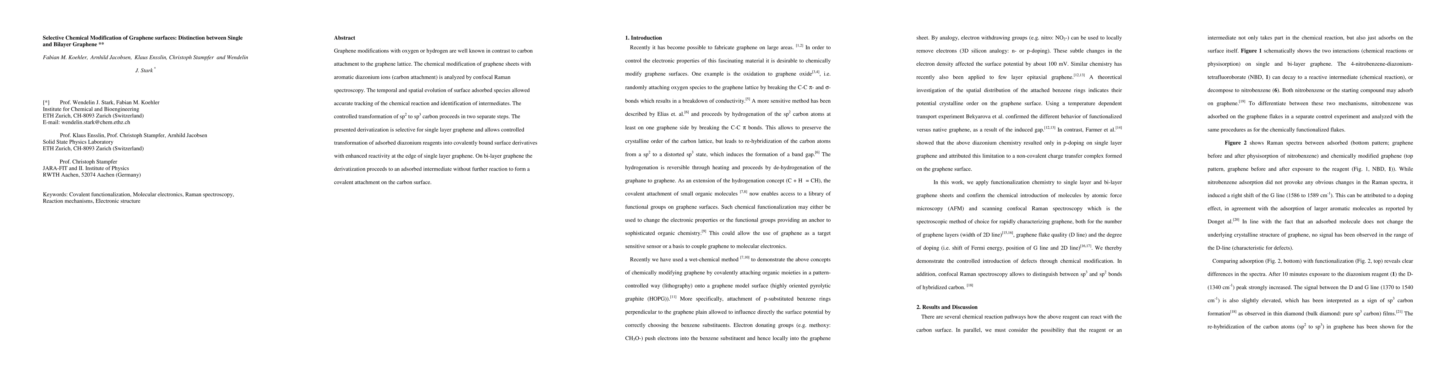 This paper investigates the selective chemical modification of single and bilayer graphene using aromatic diazonium ions, revealing distinct reaction pathways. Confocal Raman spectroscopy tracks the transformation from sp2 to sp3 carbon, showing that single-layer graphene undergoes a controlled derivatization, while bilayer graphene remains as an adsorbed intermediate without forming covalent bonds.