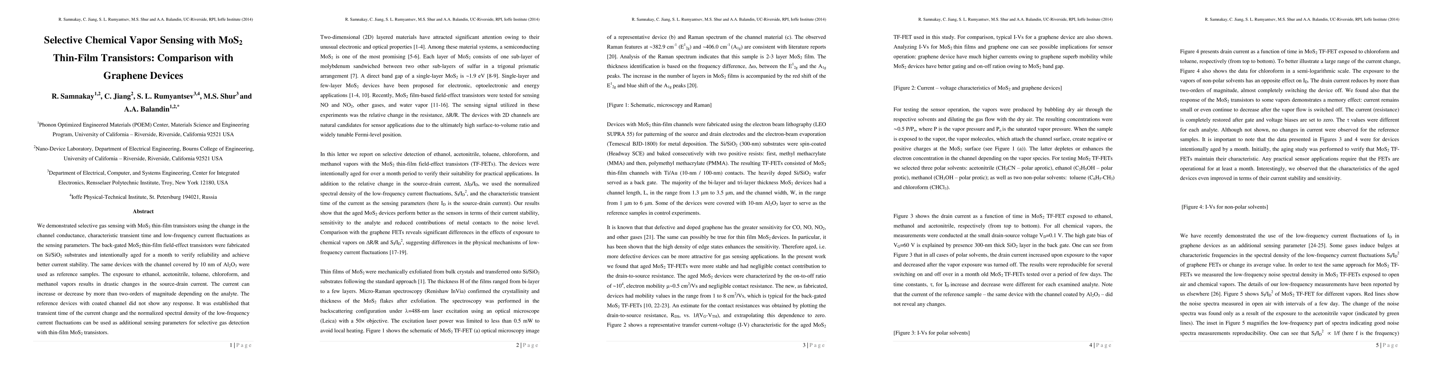 This study demonstrates selective chemical vapor sensing using few-layer MoS2 thin-film transistors, showing significant changes in channel conductance and current fluctuations in response to various vapors, while reference devices with an Al2O3-coated channel show no response, confirming the selectivity and reliability of the sensing mechanism.