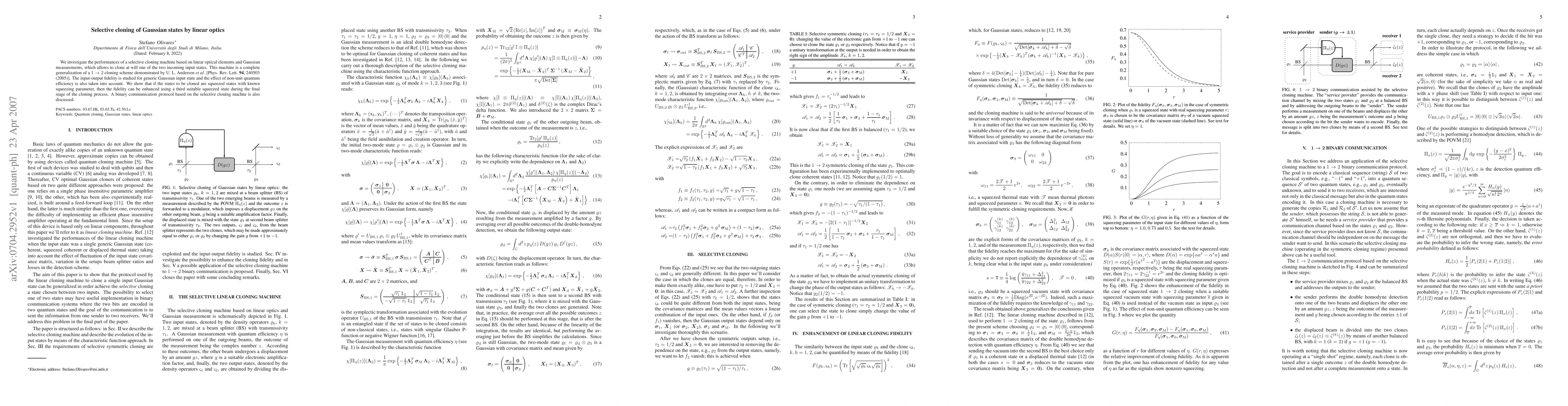 This paper explores a selective cloning machine based on linear optics and Gaussian measurements that can clone one of two input Gaussian states, generalizing previous cloning schemes. The study examines the fidelity of cloning for generic Gaussian states and considers the impact of non-unit quantum efficiency, showing enhanced fidelity for known squeezed states with a third suitable squeezed state. Additionally, a binary communication protocol utilizing the selective cloning machine is proposed.