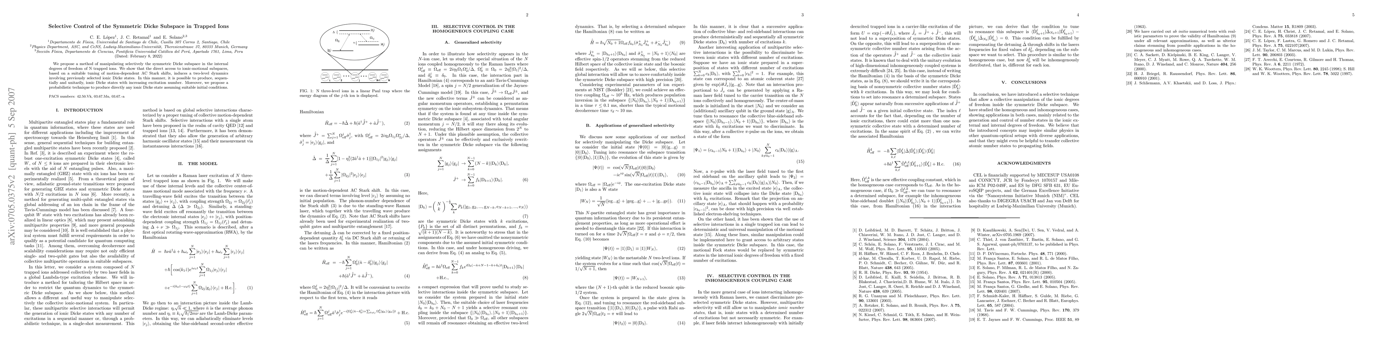 We propose a method of manipulating selectively the symmetric Dicke subspace in the internal degrees of freedom of N trapped ions. We show that the direct access to ionic-motional subspaces, based on a suitable tuning of motion-dependent AC Stark shifts, induces a two-level dynamics involving previously selected ionic Dicke states. In this manner, it is possible to produce, sequentially and unitarily, ionic Dicke states with increasing excitation number. Moreover, we propose a probabilistic technique to produce directly any ionic Dicke state assuming suitable initial conditions.