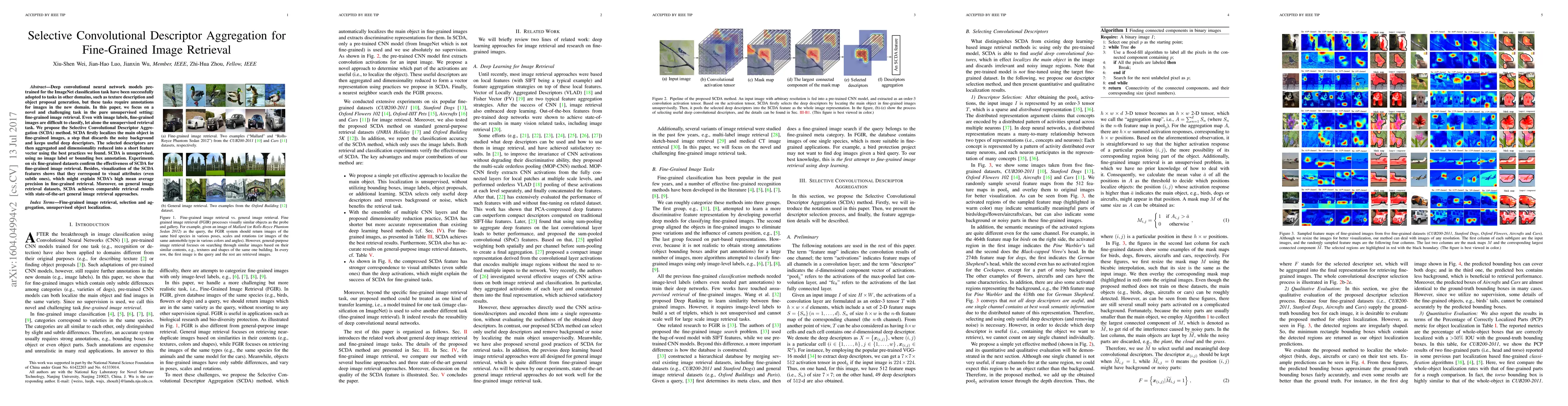 The paper proposes Selective Convolutional Descriptor Aggregation (SCDA), an unsupervised method for fine-grained image retrieval using pre-trained CNN models. SCDA first localizes the main object in fine-grained images, then aggregates and reduces selected descriptors into a feature vector.