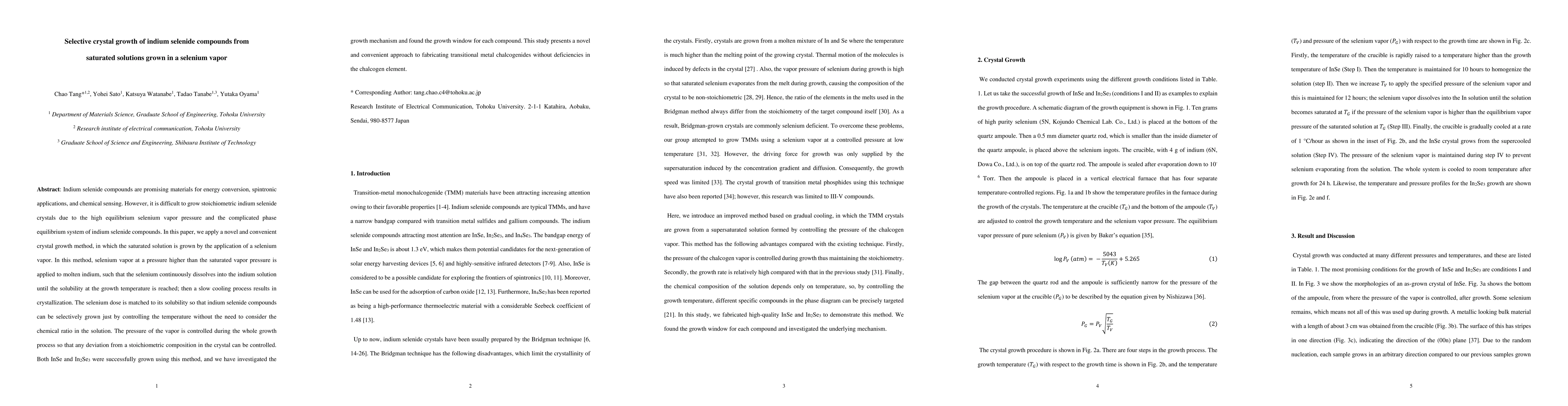 This paper introduces a novel method for growing stoichiometric indium selenide crystals by using selenium vapor to control the solubility in molten indium, enabling selective crystal growth of InSe and In2Se3 without chemical ratio considerations. The method successfully controls deviations from stoichiometry through vapor pressure management.
