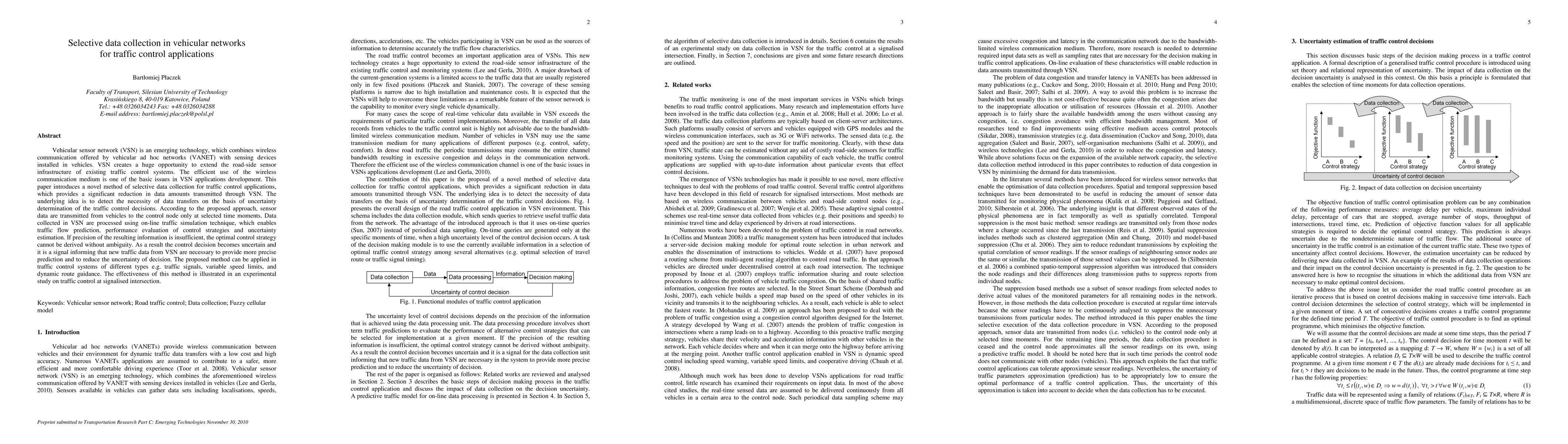 This paper proposes a selective data collection method in vehicular sensor networks (VSN) to optimize traffic control applications by reducing unnecessary data transmission. The method determines data transfer necessity based on uncertainty in traffic control decisions, transmitting data only when precision is insufficient, thereby improving efficiency and performance.