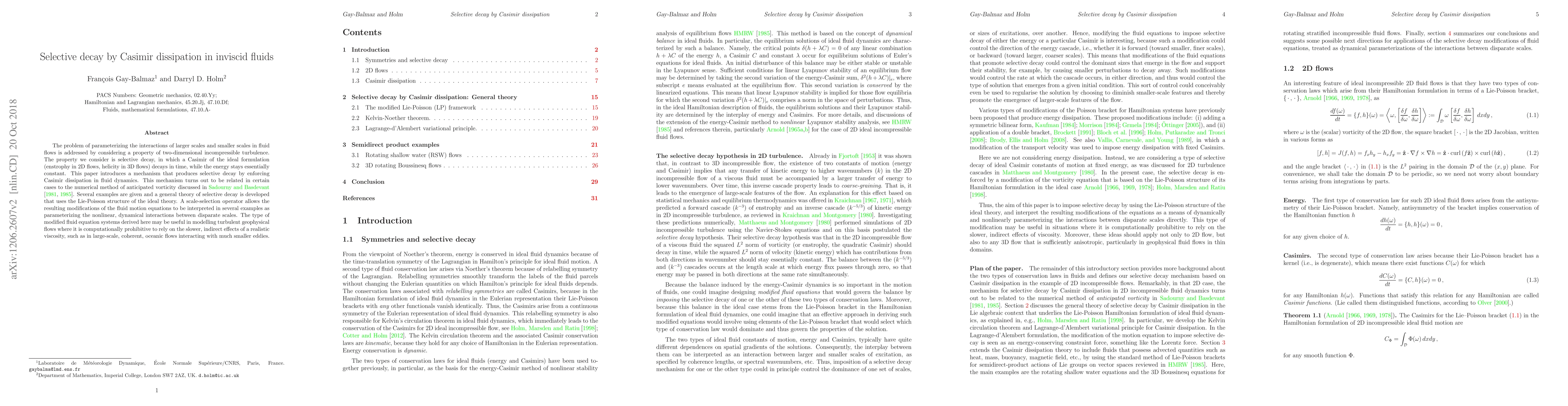 The problem of parameterizing the interactions of larger scales and smaller scales in fluid flows is addressed by considering a property of two-dimensional incompressible turbulence. The property we consider is selective decay, in which a Casimir of the ideal formulation (enstrophy in 2D flows, helicity in 3D flows) decays in time, while the energy stays essentially constant. This paper introduces a mechanism that produces selective decay by enforcing Casimir dissipation in fluid dynamics. This mechanism turns out to be related in certain cases to the numerical method of anticipated vorticity discussed in \cite{SaBa1981,SaBa1985}. Several examples are given and a general theory of selective decay is developed that uses the Lie-Poisson structure of the ideal theory. A scale-selection operator allows the resulting modifications of the fluid motion equations to be interpreted in several examples as parameterizing the nonlinear, dynamical interactions between disparate scales. The type of modified fluid equation systems derived here may be useful in modelling turbulent geophysical flows where it is computationally prohibitive to rely on the slower, indirect effects of a realistic viscosity, such as in large-scale, coherent, oceanic flows interacting with much smaller eddies.