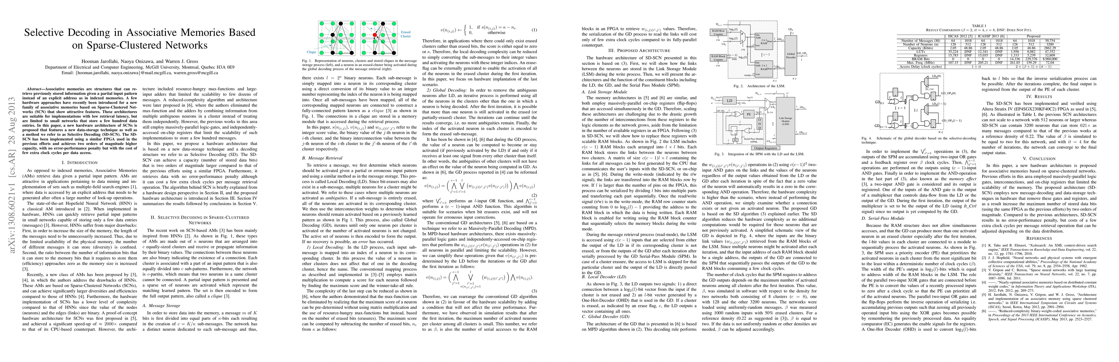 This paper proposes a new hardware architecture for Sparse-Clustered Networks (SCN) associative memories featuring a novel data-storage technique and Selective Decoding (SD-SCN) to achieve two orders of magnitude higher storage capacity compared to previous efforts, without compromising error performance.
