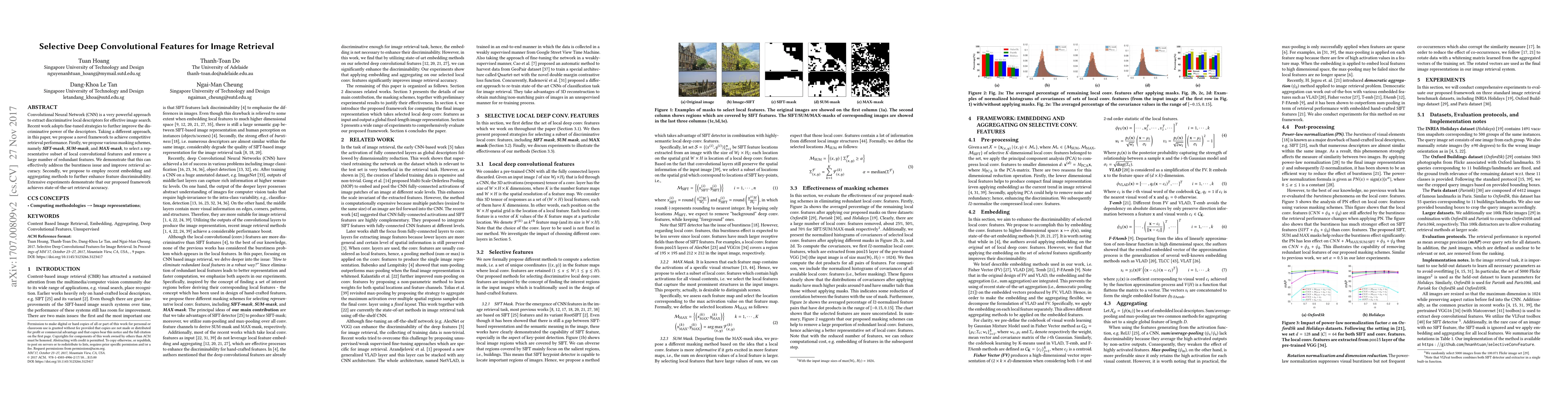 This paper proposes a novel framework for image retrieval using selective deep convolutional features. It introduces masking schemes to filter out redundant features and employs embedding and aggregating methods to enhance feature discriminability, achieving state-of-the-art retrieval accuracy.