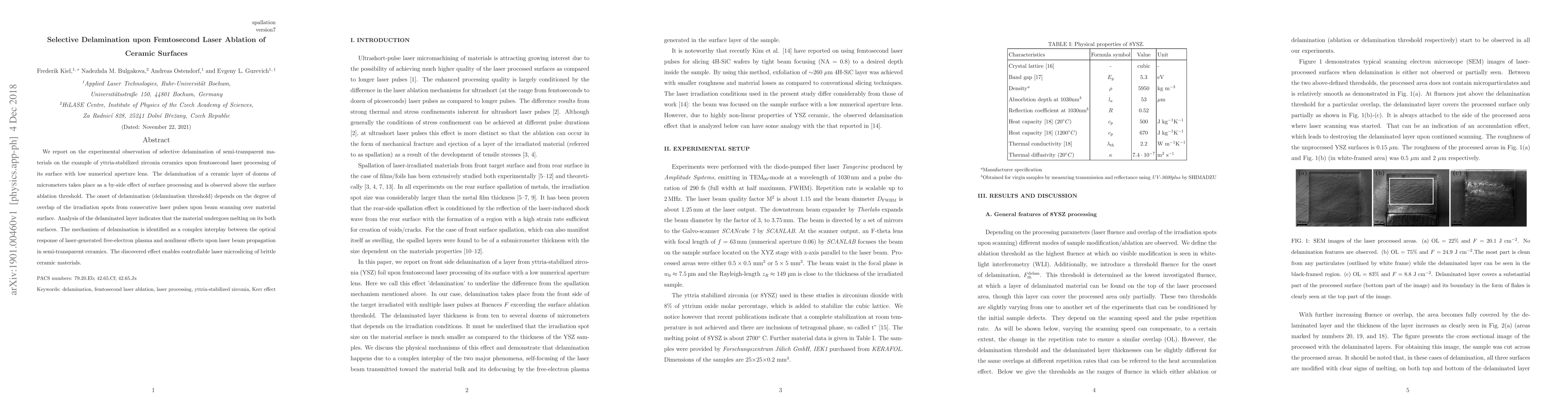 This study reports selective delamination of yttria-stabilized zirconia ceramics via femtosecond laser ablation, revealing a complex interplay between laser-induced plasma and nonlinear effects. The delamination threshold depends on the overlap of laser pulses, allowing for controllable laser microslicing of brittle ceramics.