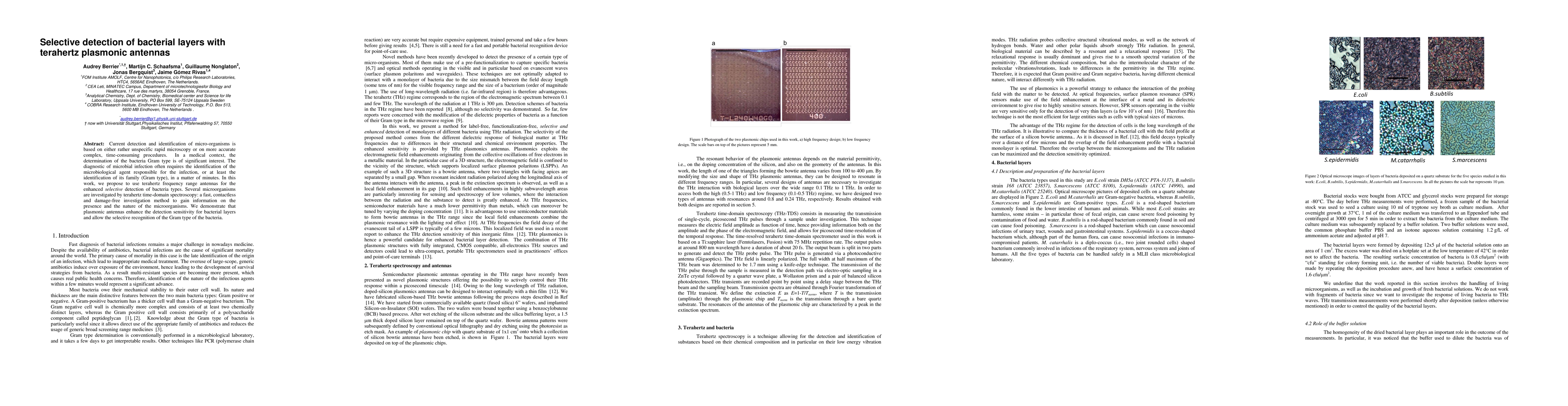 Researchers propose using terahertz plasmonic antennas to selectively detect bacterial layers for rapid identification in a matter of minutes. They demonstrate enhanced detection sensitivity and selective recognition of Gram types with this method.