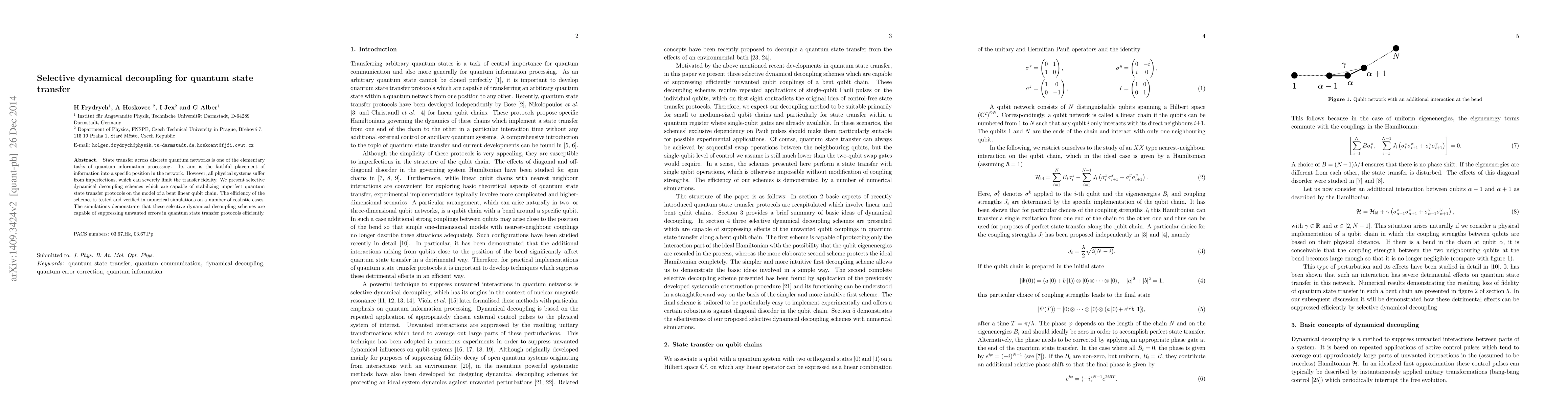 State transfer across discrete quantum networks is one of the elementary tasks of quantum information processing. Its aim is the faithful placement of information into a specific position in the network. However, all physical systems suffer from imperfections, which can severely limit the transfer fidelity. We present selective dynamical decoupling schemes which are capable of stabilizing imperfect quantum state transfer protocols on the model of a bent linear qubit chain. The efficiency of the schemes is tested and verified in numerical simulations on a number of realistic cases. The simulations demonstrate that these selective dynamical decoupling schemes are capable of suppressing unwanted errors in quantum state transfer protocols efficiently.