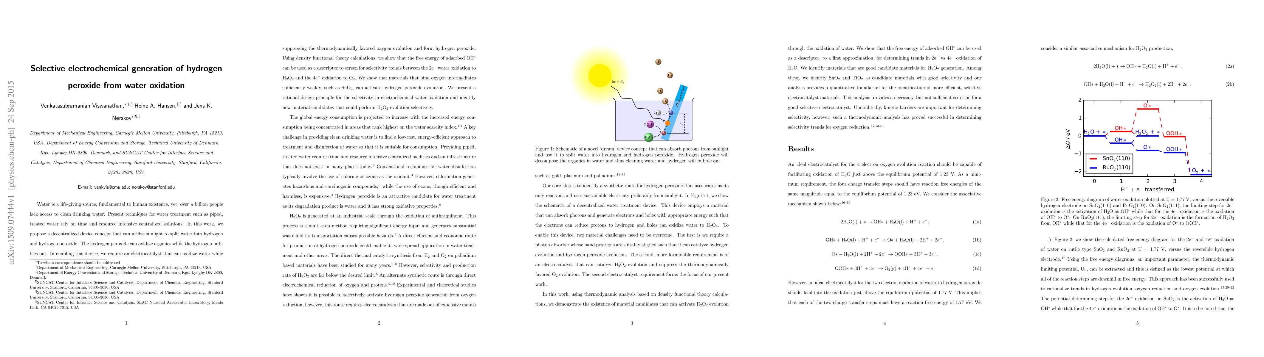This paper proposes a decentralized device to generate hydrogen peroxide from water oxidation using sunlight, aiming to provide a cleaner water treatment solution. The study identifies SnO$_2$ as a material that selectively promotes the formation of hydrogen peroxide over oxygen, based on density functional theory calculations and a new design principle for electrocatalysts.