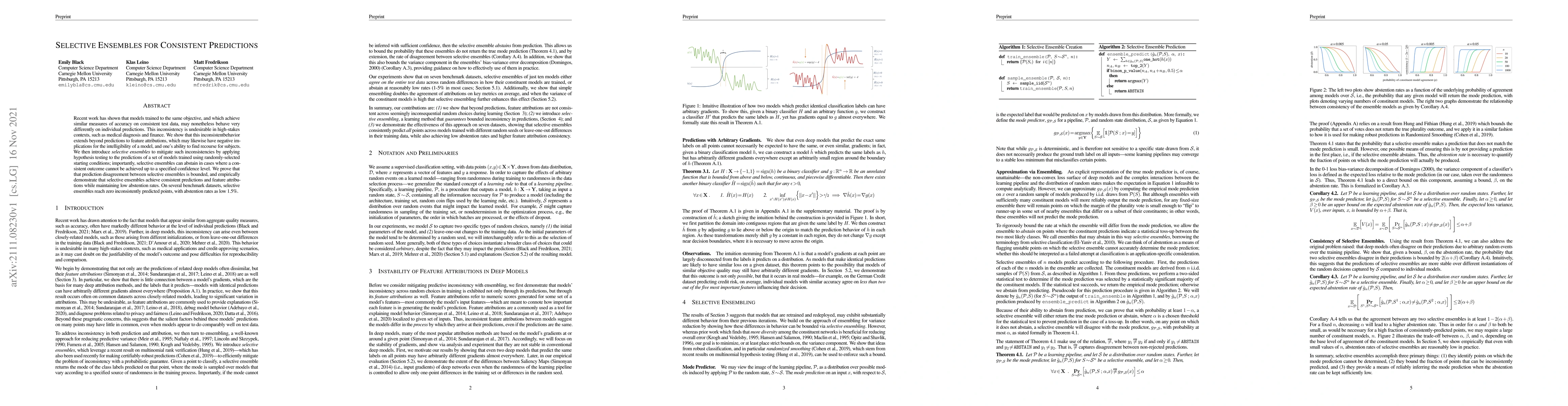 Recent work has shown that models trained to the same objective, and which achieve similar measures of accuracy on consistent test data, may nonetheless behave very differently on individual predictions. This inconsistency is undesirable in high-stakes contexts, such as medical diagnosis and finance. We show that this inconsistent behavior extends beyond predictions to feature attributions, which may likewise have negative implications for the intelligibility of a model, and one's ability to find recourse for subjects. We then introduce selective ensembles to mitigate such inconsistencies by applying hypothesis testing to the predictions of a set of models trained using randomly-selected starting conditions; importantly, selective ensembles can abstain in cases where a consistent outcome cannot be achieved up to a specified confidence level. We prove that that prediction disagreement between selective ensembles is bounded, and empirically demonstrate that selective ensembles achieve consistent predictions and feature attributions while maintaining low abstention rates. On several benchmark datasets, selective ensembles reach zero inconsistently predicted points, with abstention rates as low 1.5%.