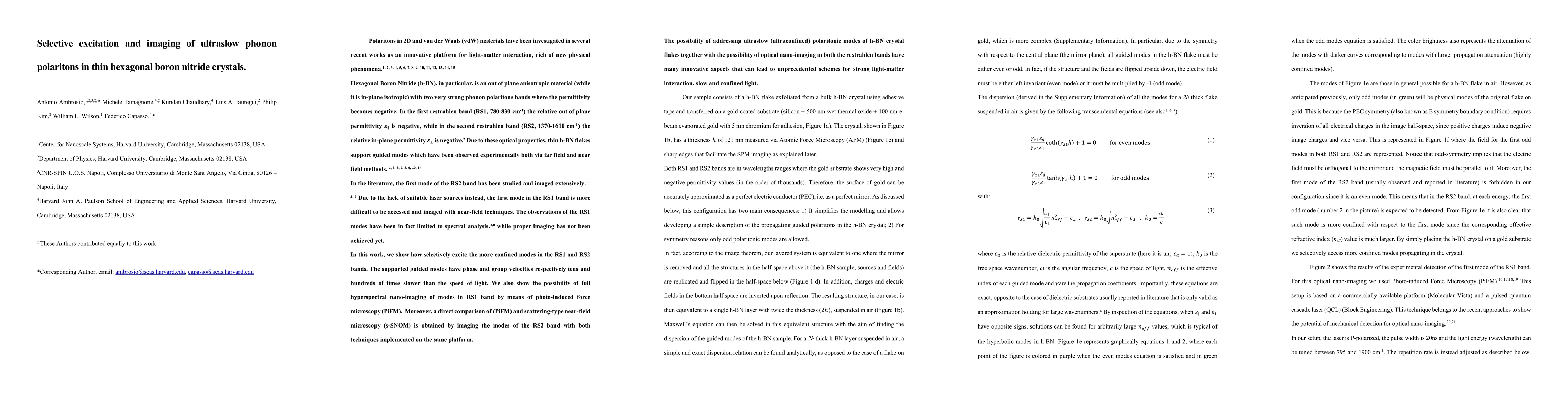Polaritons in 2D and van der Waals (vdW) materials have been investigated in several recent works as an innovative platform for light-matter interaction, rich of new physical phenomena.Hexagonal Boron Nitride (h-BN), in particular, is an out of plane anisotropic material (while it is in-plane isotropic) with two very strong phonon polaritons bands where the permittivity becomes negative. In the first restrahlen band (RS1, 780-830 cm-1) the relative out of plane permittivity is negative, while in the second restrahlen band (RS2, 1370-1610 cm-1) the relative in-plane permittivity is negative. Due to these optical properties, thin h-BN flakes support guided modes which have been observed experimentally both via far field and near field methods. In this work, we show how selectively excite the more confined modes in the RS1 and RS2 bands. The supported guided modes have phase and group velocities respectively tens and hundreds of times slower than the speed of light. We also show the possibility of full hyperspectral nano-imaging of modes in RS1 band by means of photo-induced force microscopy (PiFM). Moreover, a direct comparison of (PiFM) and scattering-type near-field microscopy (s-SNOM) is obtained by imaging the modes of the RS2 band with both techniques implemented on the same platform. The possibility of addressing ultraslow (ultraconfined) polaritonic modes of h-BN crystal flakes together with the possibility of optical nano-imaging in both the restrahlen bands have many innovative aspects that can lead to unprecedented schemes for strong light-matter interaction, slow and confined light.