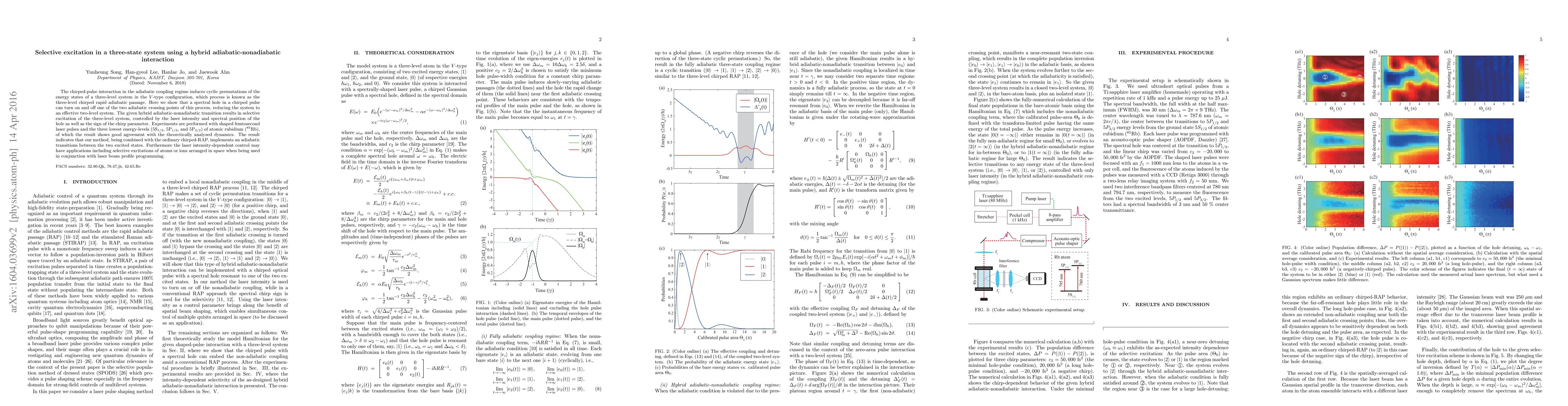 This paper demonstrates selective excitation in a three-state system using a hybrid adiabatic-nonadiabatic interaction, showing that a spectral hole in a chirped pulse can control the excitation between energy states. Experiments on rubidium atoms confirm the theoretical predictions, indicating potential applications in controlling atomic or ionic excitations with laser beam profile programming.