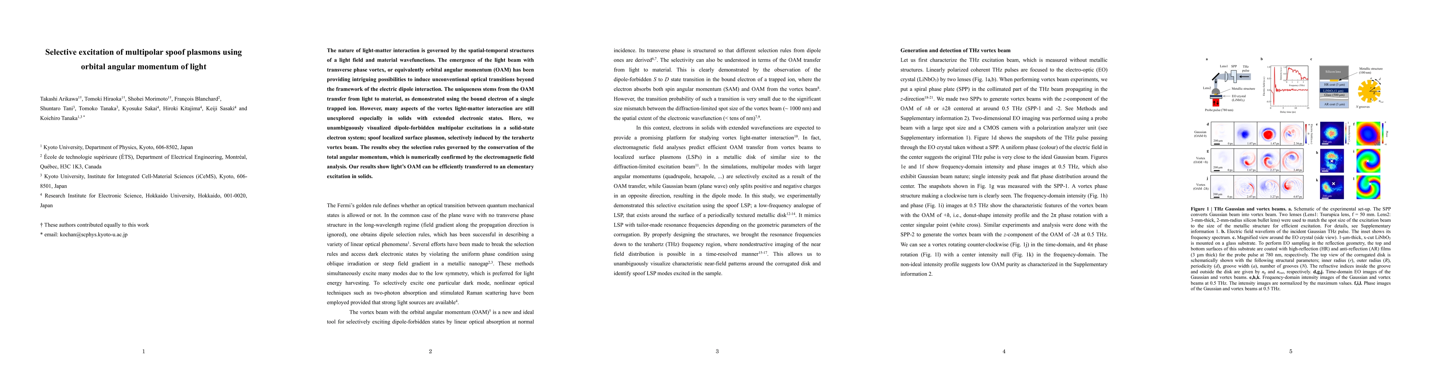 This paper demonstrates the selective excitation of multipolar spoof plasmons in solids using the orbital angular momentum (OAM) of light, showing that OAM can efficiently transfer to elementary excitations in solid-state electron systems, governed by the conservation of total angular momentum. The study visualizes dipole-forbidden multipolar excitations induced by a terahertz vortex beam.