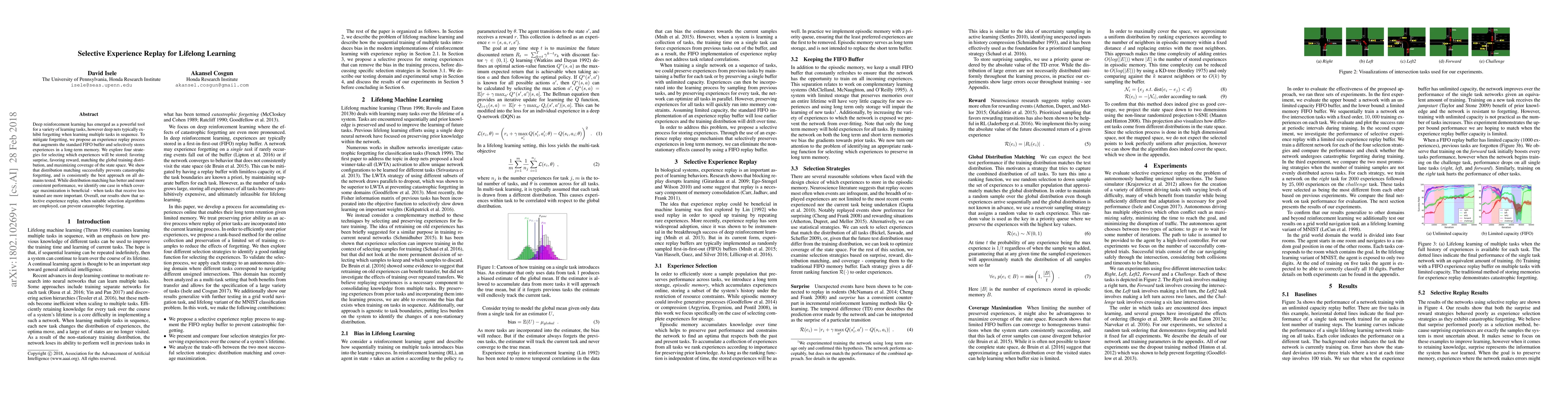 Deep reinforcement learning has emerged as a powerful tool for a variety of learning tasks, however deep nets typically exhibit forgetting when learning multiple tasks in sequence. To mitigate forgetting, we propose an experience replay process that augments the standard FIFO buffer and selectively stores experiences in a long-term memory. We explore four strategies for selecting which experiences will be stored: favoring surprise, favoring reward, matching the global training distribution, and maximizing coverage of the state space. We show that distribution matching successfully prevents catastrophic forgetting, and is consistently the best approach on all domains tested. While distribution matching has better and more consistent performance, we identify one case in which coverage maximization is beneficial - when tasks that receive less trained are more important. Overall, our results show that selective experience replay, when suitable selection algorithms are employed, can prevent catastrophic forgetting.