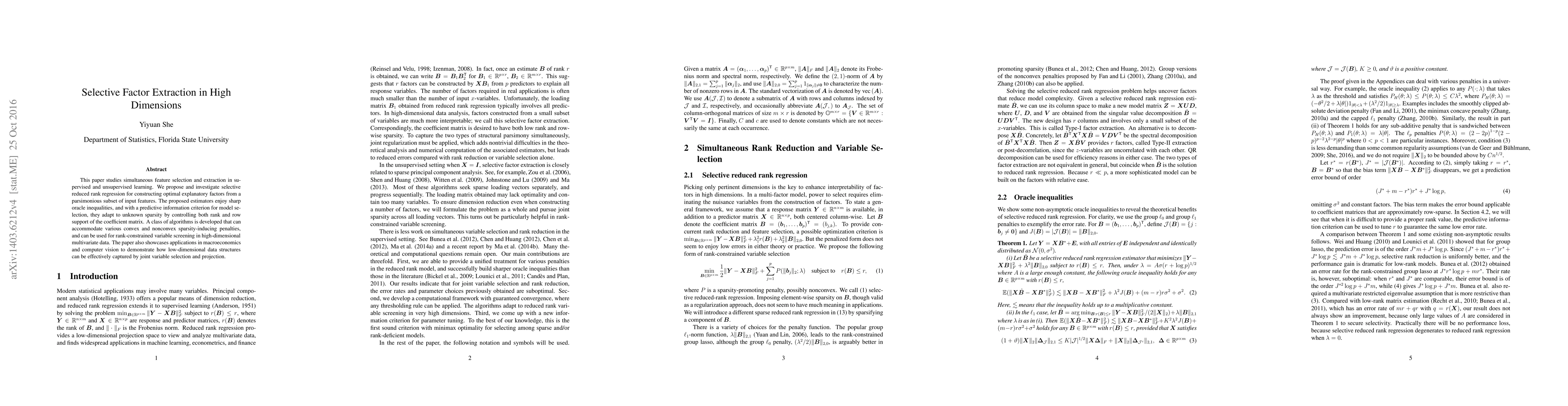 This paper studies simultaneous feature selection and extraction in supervised and unsupervised learning. We propose and investigate selective reduced rank regression for constructing optimal explanatory factors from a parsimonious subset of input features. The proposed estimators enjoy sharp oracle inequalities, and with a predictive information criterion for model selection, they adapt to unknown sparsity by controlling both rank and row support of the coefficient matrix. A class of algorithms is developed that can accommodate various convex and nonconvex sparsity-inducing penalties, and can be used for rank-constrained variable screening in high-dimensional multivariate data. The paper also showcases applications in macroeconomics and computer vision to demonstrate how low-dimensional data structures can be effectively captured by joint variable selection and projection.