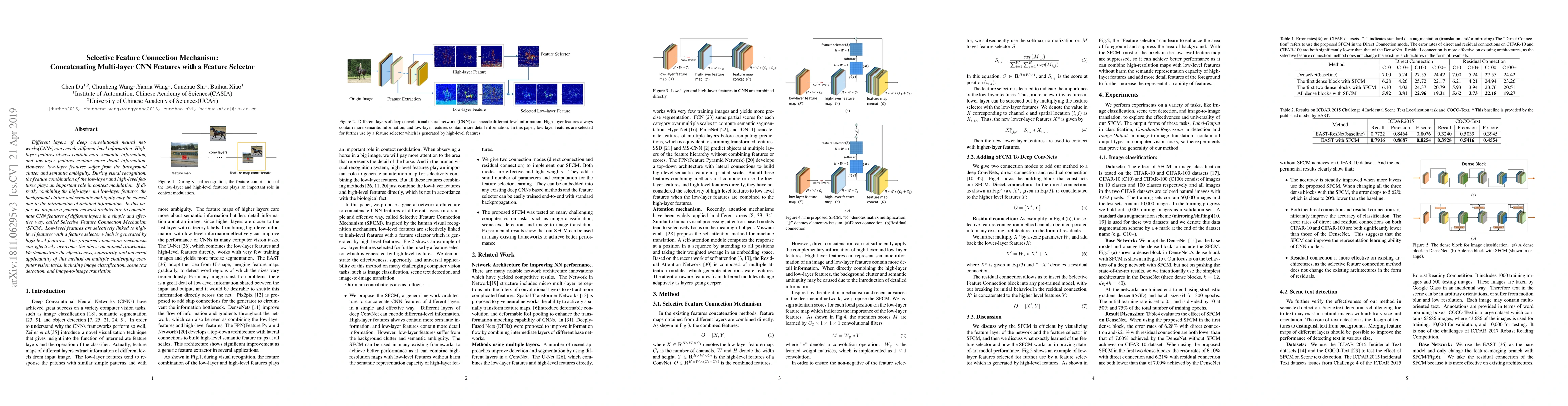 Different layers of deep convolutional neural networks(CNNs) can encode different-level information. High-layer features always contain more semantic information, and low-layer features contain more detail information. However, low-layer features suffer from the background clutter and semantic ambiguity. During visual recognition, the feature combination of the low-layer and high-level features plays an important role in context modulation. If directly combining the high-layer and low-layer features, the background clutter and semantic ambiguity may be caused due to the introduction of detailed information. In this paper, we propose a general network architecture to concatenate CNN features of different layers in a simple and effective way, called Selective Feature Connection Mechanism (SFCM). Low-level features are selectively linked to high-level features with a feature selector which is generated by high-level features. The proposed connection mechanism can effectively overcome the above-mentioned drawbacks. We demonstrate the effectiveness, superiority, and universal applicability of this method on multiple challenging computer vision tasks, including image classification, scene text detection, and image-to-image translation.