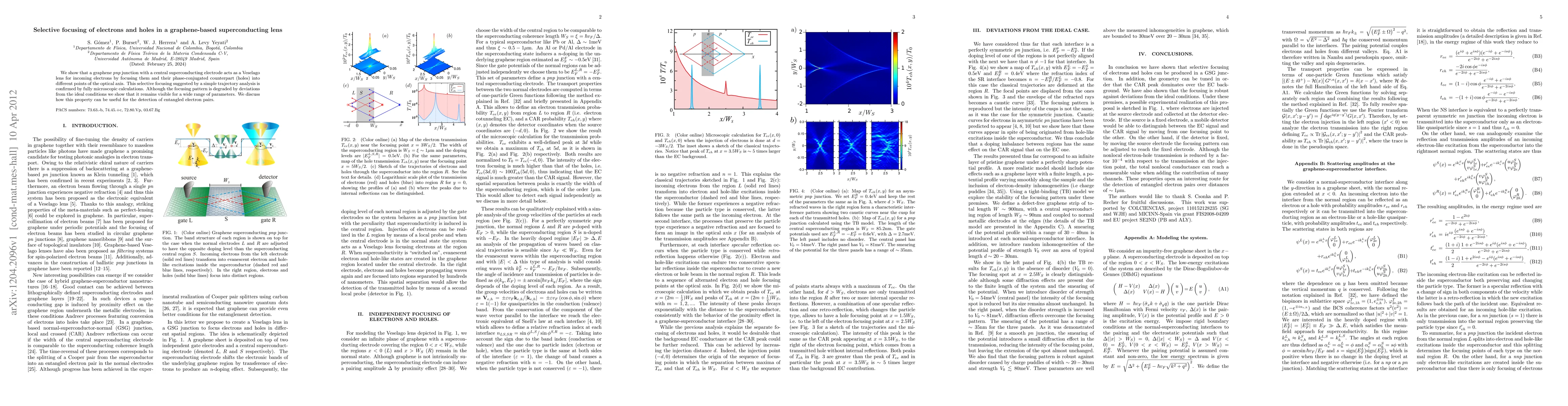 A graphene pnp junction with a superconducting electrode focuses electrons and holes into different points, enabling potential applications in detecting entangled electron pairs. The selective focusing is robust despite deviations from ideal conditions.