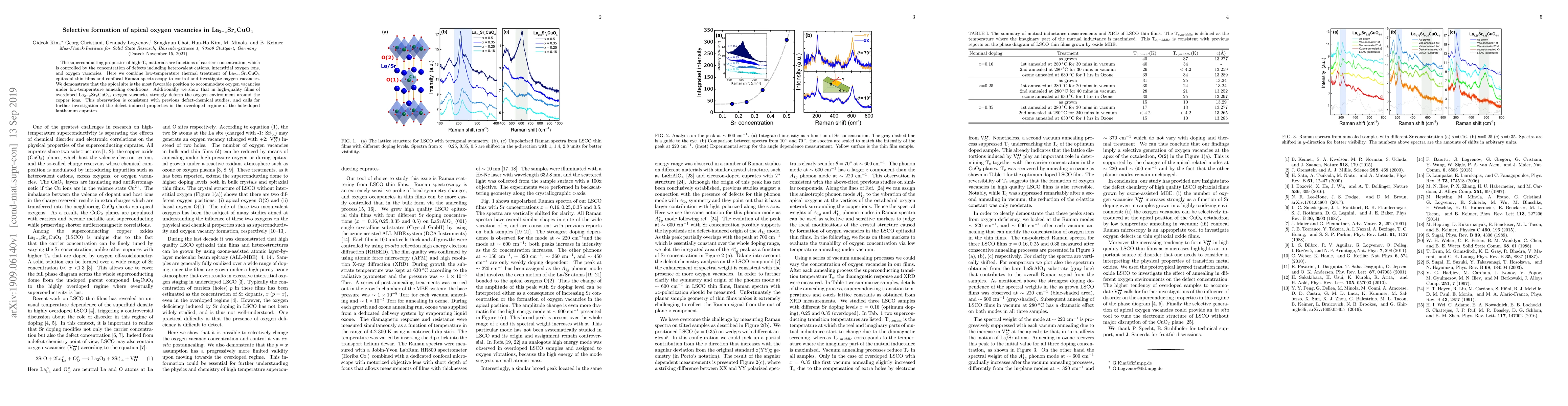 This study demonstrates selective formation of apical oxygen vacancies in La$_{2-x}$Sr$_{x}$CuO$_{4}$ thin films via low-temperature thermal treatment, using confocal Raman spectroscopy. The findings show that the apical site is the preferred location for oxygen vacancies, which significantly impacts the oxygen environment around copper ions in overdoped films.