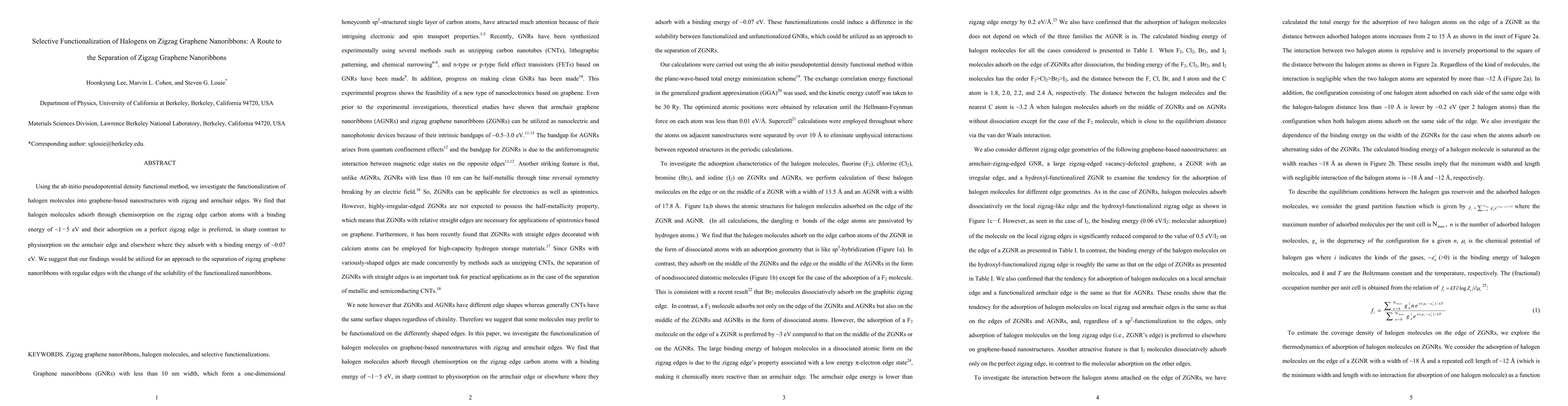 This study uses ab initio methods to show that halogen molecules preferentially chemisorb onto zigzag edge carbon atoms in graphene nanoribbons, providing a potential route for separating zigzag graphene nanoribbons based on their altered solubility after functionalization.
