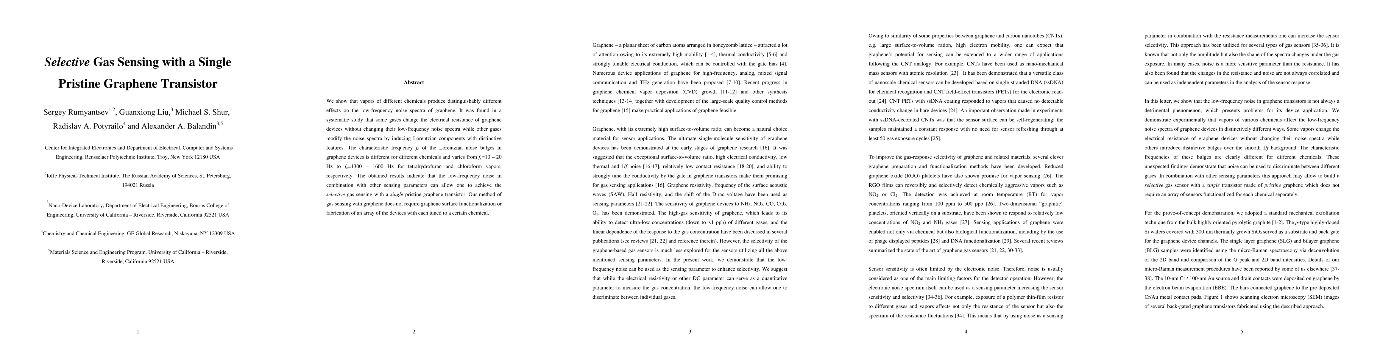 This paper demonstrates that pristine graphene transistors can selectively sense different gases by detecting distinct changes in their low-frequency noise spectra, without requiring surface functionalization or multiple devices. The unique noise characteristics, such as the frequency of Lorentzian noise bulges, enable the identification of specific chemical vapors.