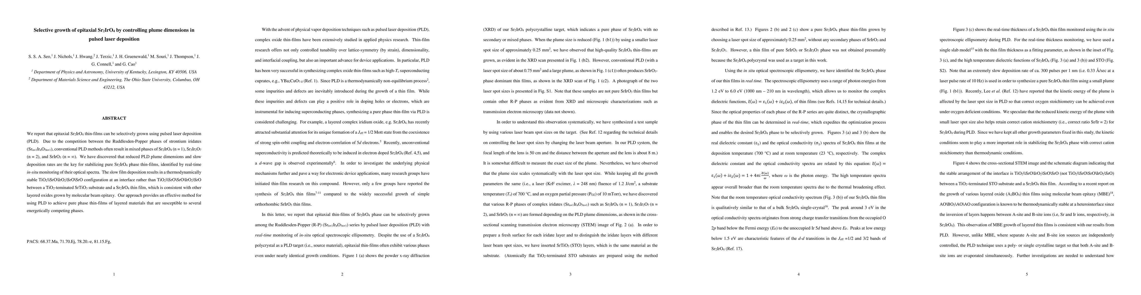 This paper reports the selective growth of epitaxial Sr2IrO4 thin-films using pulsed laser deposition (PLD) by controlling plume dimensions and deposition rates, achieving a pure phase without mixed Ruddlesden-Popper phases. The method stabilizes a thermodynamically favorable interface configuration.