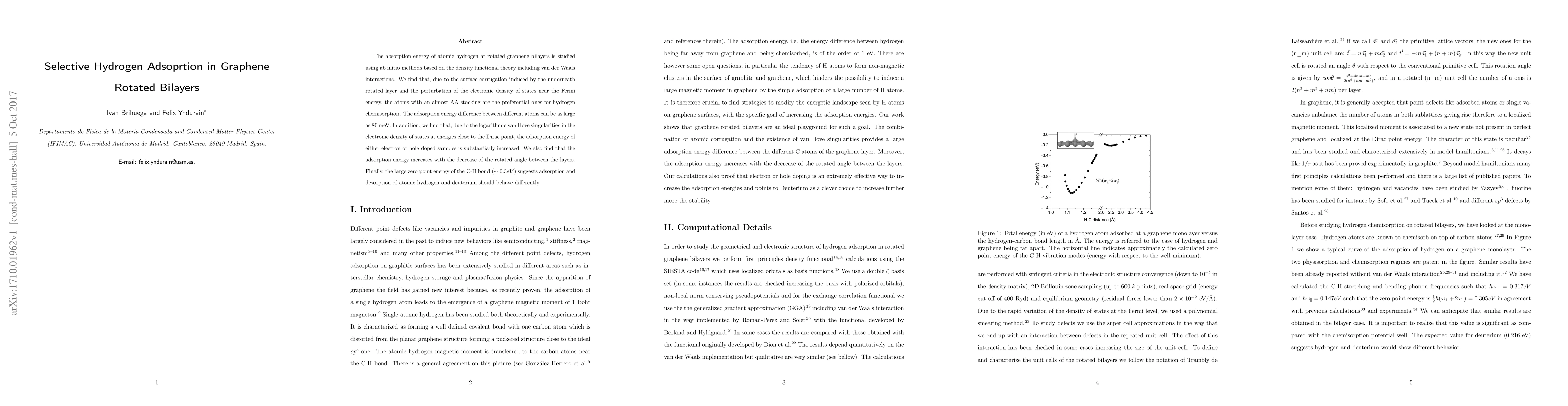 This paper investigates the selective adsorption of hydrogen atoms in rotated graphene bilayers using density functional theory. It finds that hydrogen preferentially adsorbs at nearly AA-stacked sites due to surface corrugation and electronic density perturbations, with adsorption energy differences reaching 80 meV. Additionally, doping and reduced rotation angles enhance adsorption energy, while the large zero point energy of C-H bonds indicates different behaviors for hydrogen and deuterium adsorption.