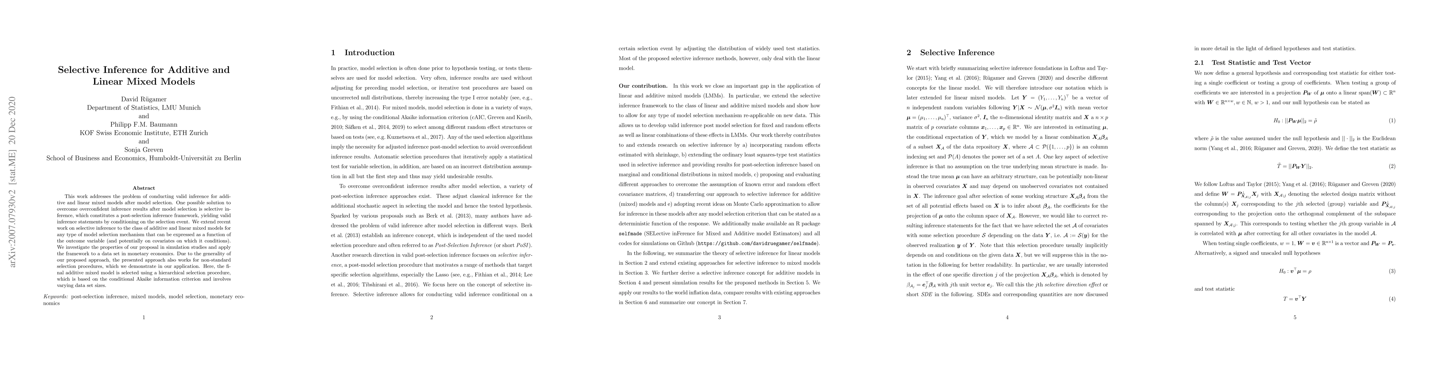 This paper develops a selective inference framework for valid post-selection inference in additive and linear mixed models, addressing overconfidence issues after model selection. The method is demonstrated through simulations and applied to a monetary economics dataset, showing its effectiveness for non-standard selection procedures.