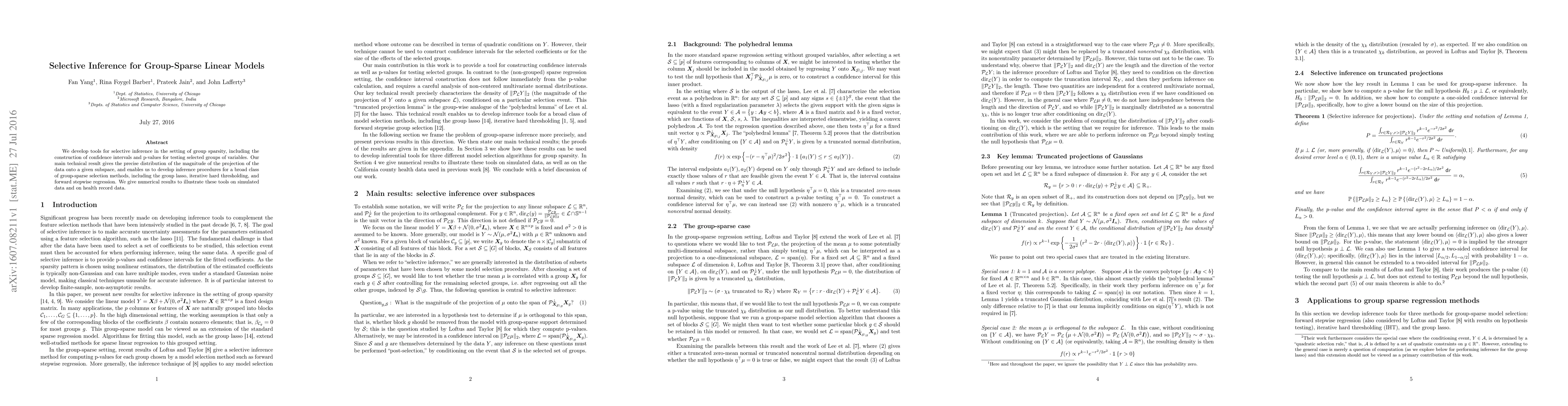 This paper develops methods for selective inference in group-sparse linear models, providing tools for constructing confidence intervals and p-values for selected variable groups. It achieves this by determining the precise distribution of data projections onto subspaces, enabling inference for various group-sparse selection techniques.