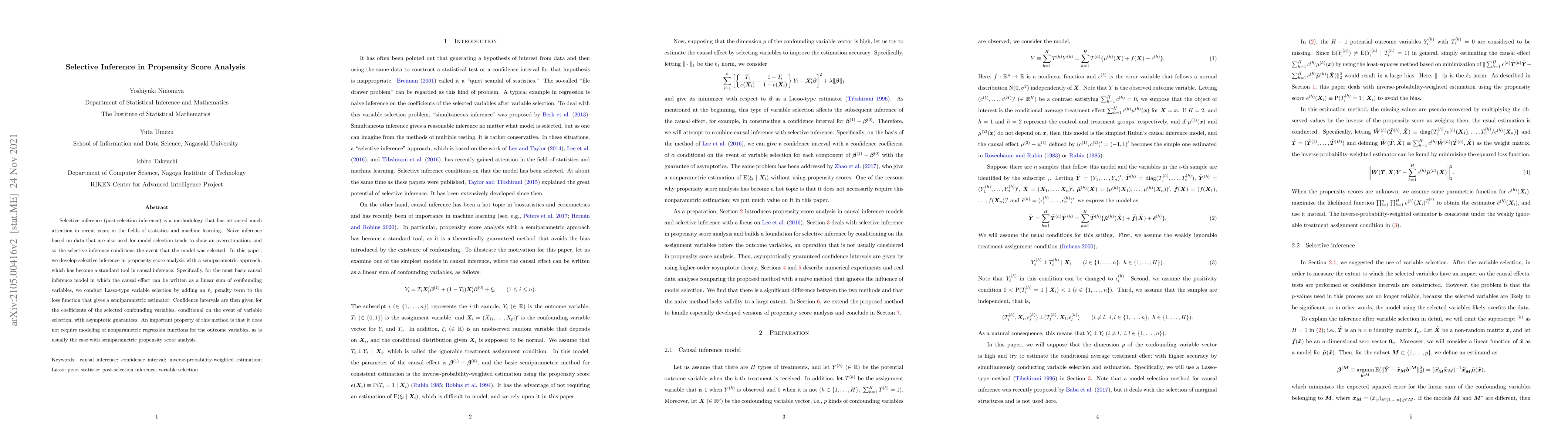 This paper develops a semiparametric approach for selective inference in propensity score analysis, addressing overestimation issues in post-selection inference. It employs Lasso-type variable selection with an $\ell_1$ penalty to provide conditional confidence intervals for selected confounding variables, without requiring nonparametric regression modeling.