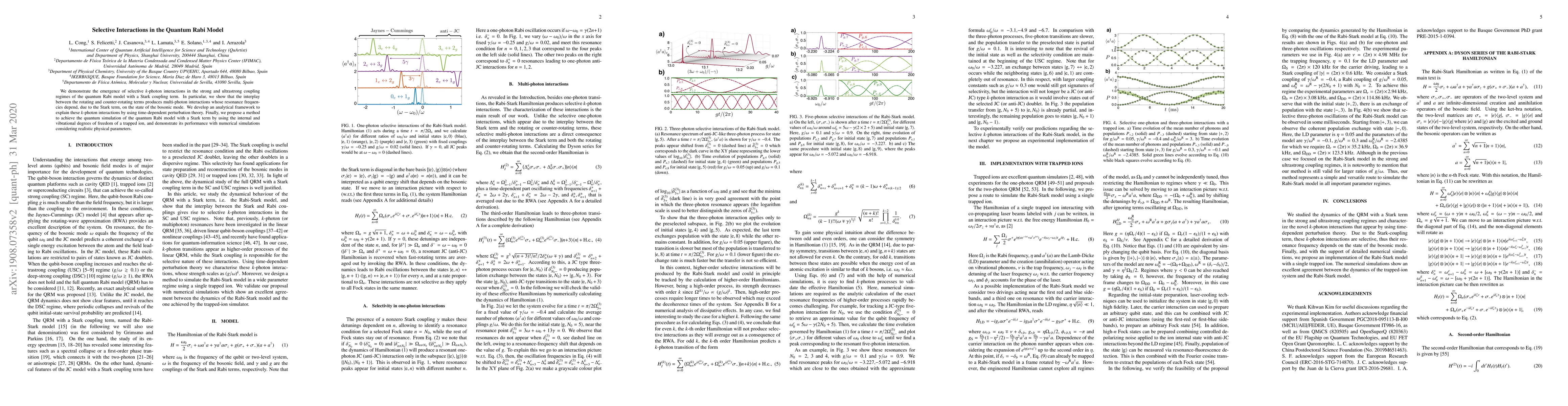 We demonstrate the emergence of selective $k$-photon interactions in the strong and ultrastrong coupling regimes of the quantum Rabi model with a Stark coupling term. In particular, we show that the interplay between the rotating and counter-rotating terms produces multi-photon interactions whose resonance frequencies depend, due to the Stark term, on the state of the bosonic mode. We develop an analytical framework to explain these $k$-photon interactions by using time-dependent perturbation theory. Finally, we propose a method to achieve the quantum simulation of the quantum Rabi model with a Stark term by using the internal and vibrational degrees of freedom of a trapped ion, and demonstrate its performance with numerical simulations considering realistic physical parameters.
