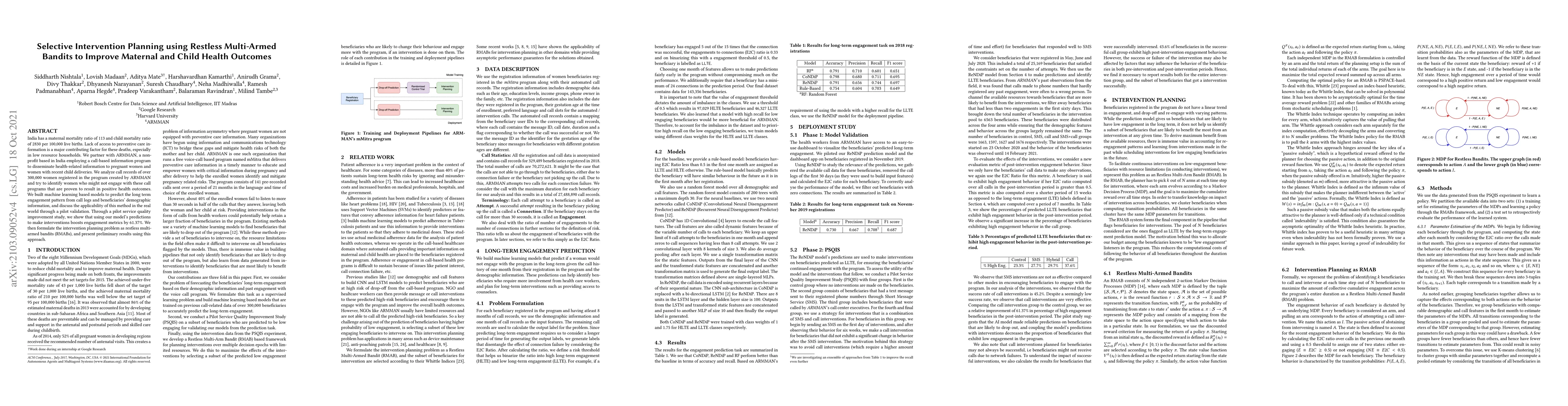 This paper proposes a machine learning model to predict engagement patterns for a call-based health information program in India, aiming to improve maternal and child health outcomes. The study shows a 61.37% increase in engagement through targeted interventions, and introduces restless multi-armed bandit algorithms for selective intervention planning.