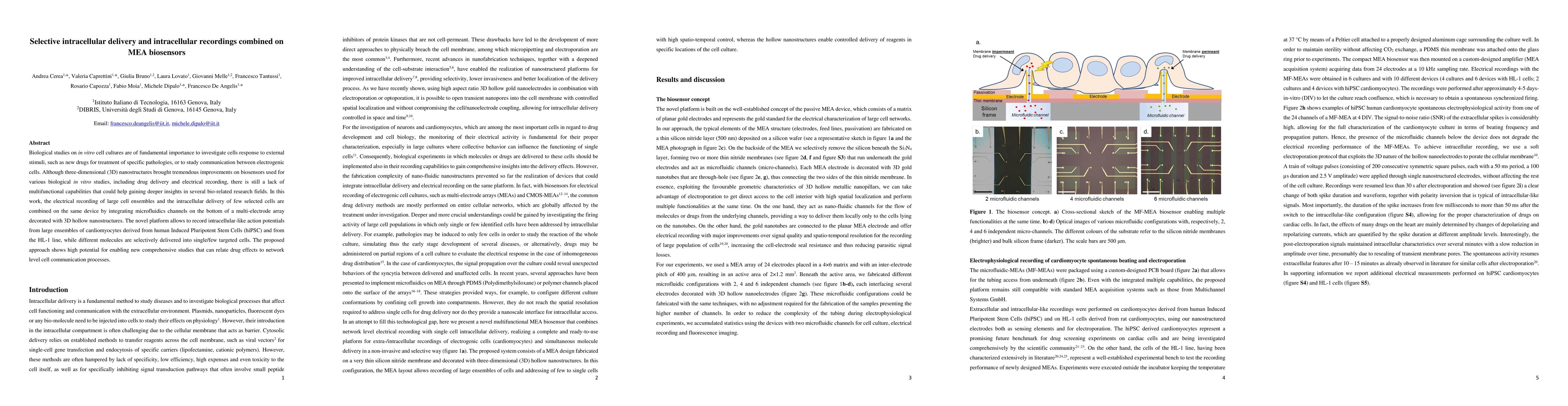 This research paper presents a novel platform integrating microfluidic channels and 3D nanostructures on a multi-electrode array for simultaneous intracellular delivery and electrical recording from large cell ensembles. The platform enables selective delivery of molecules to targeted cells while recording action potentials, offering new insights into drug effects and cell communication.