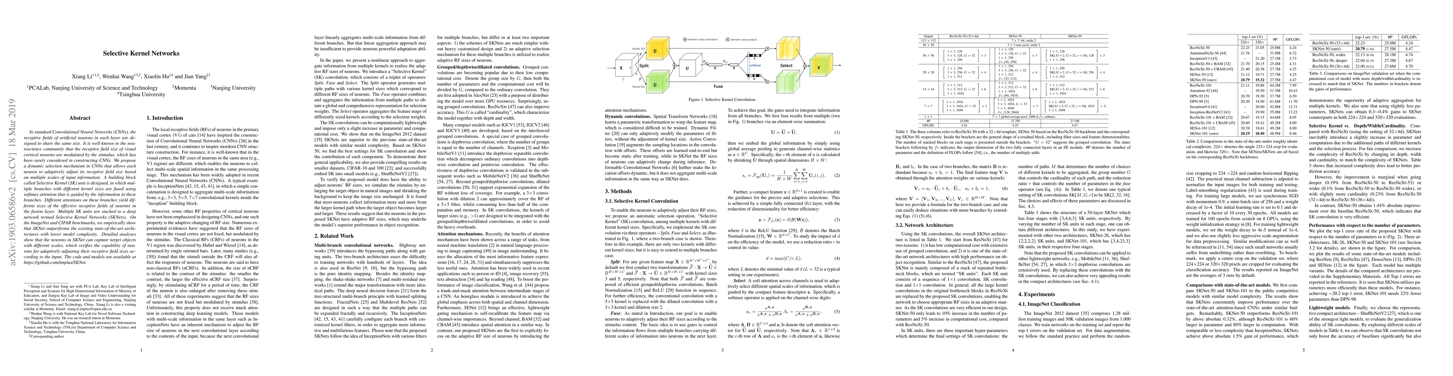 In standard Convolutional Neural Networks (CNNs), the receptive fields of artificial neurons in each layer are designed to share the same size. It is well-known in the neuroscience community that the receptive field size of visual cortical neurons are modulated by the stimulus, which has been rarely considered in constructing CNNs. We propose a dynamic selection mechanism in CNNs that allows each neuron to adaptively adjust its receptive field size based on multiple scales of input information. A building block called Selective Kernel (SK) unit is designed, in which multiple branches with different kernel sizes are fused using softmax attention that is guided by the information in these branches. Different attentions on these branches yield different sizes of the effective receptive fields of neurons in the fusion layer. Multiple SK units are stacked to a deep network termed Selective Kernel Networks (SKNets). On the ImageNet and CIFAR benchmarks, we empirically show that SKNet outperforms the existing state-of-the-art architectures with lower model complexity. Detailed analyses show that the neurons in SKNet can capture target objects with different scales, which verifies the capability of neurons for adaptively adjusting their receptive field sizes according to the input. The code and models are available at https://github.com/implus/SKNet.