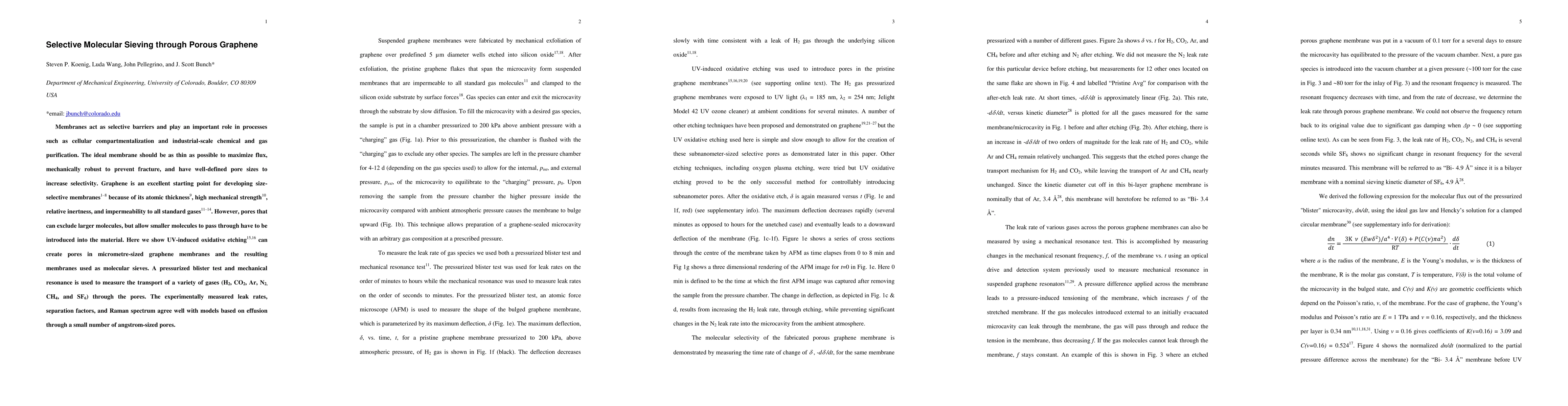 This paper demonstrates that UV-induced oxidative etching can create micrometre-sized pores in graphene membranes, enabling selective molecular sieving. Experimental results show effective separation of various gases through these pores, aligning well with theoretical models of effusion.