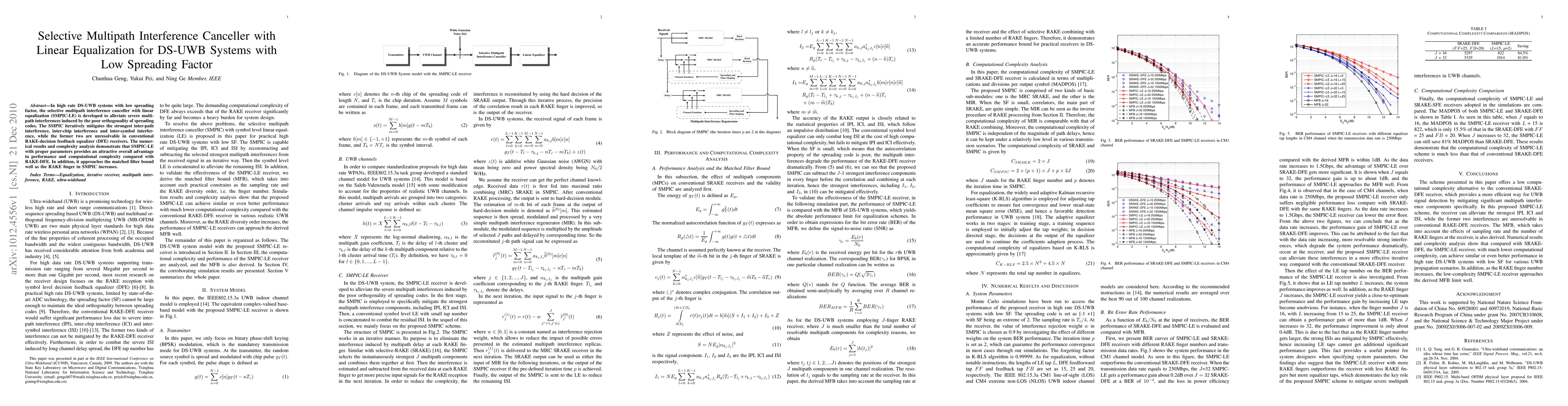 This paper introduces a Selective Multipath Interference Canceller with Linear Equalization (SMPIC-LE) for high-rate DS-UWB systems with low spreading factors to mitigate severe multipath interference. SMPIC-LE outperforms conventional RAKE-DFE receivers by iteratively reducing inter-path, inter-chip, and inter-symbol interference, demonstrating better performance and lower computational complexity.