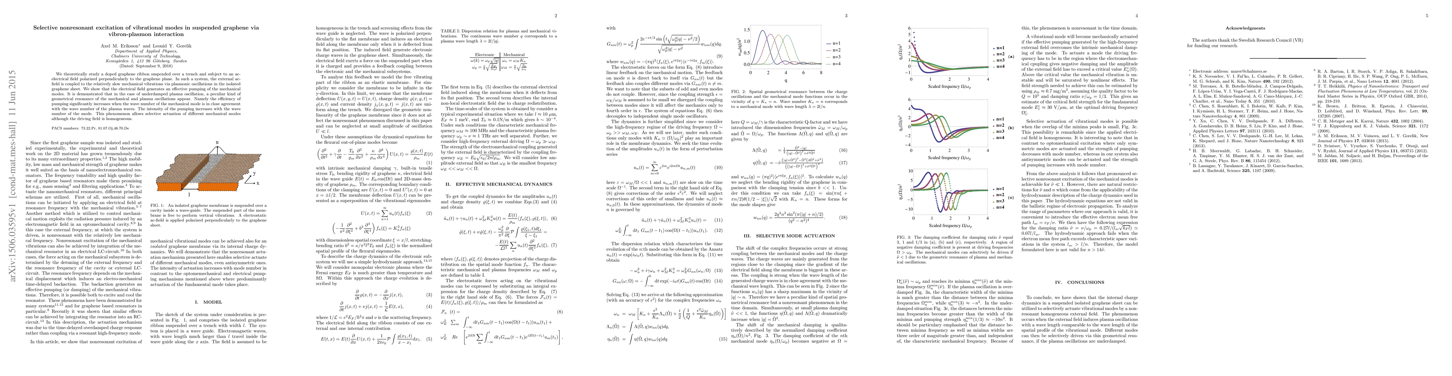 This paper theoretically investigates how an ac-electrical field can selectively excite specific vibrational modes in suspended graphene through vibron-plasmon interactions. The study reveals that underdamped plasmon oscillations enhance the efficiency of mechanical mode pumping when their wave numbers align, enabling targeted actuation despite a uniform driving field.